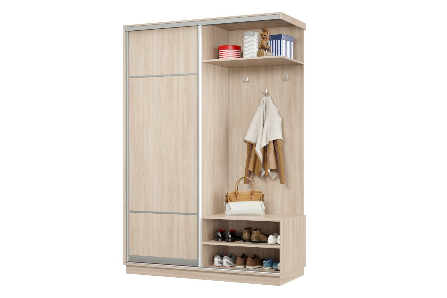Дверь делит шкаф на 2 равные части: отделение для верхней одежды и отделение с полками и крючками.