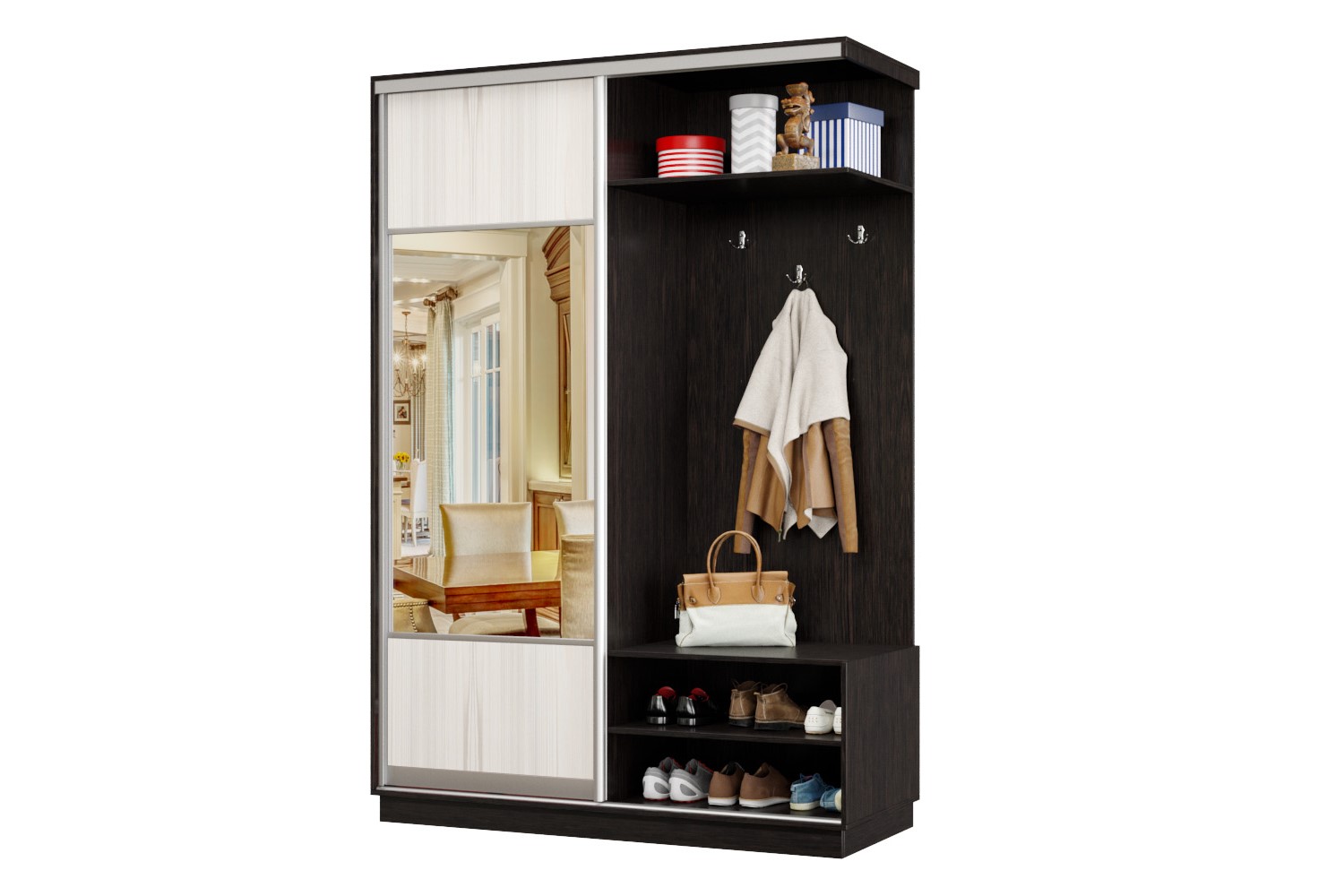 Дверь делит шкаф на 2 равные части: отделение для верхней одежды и отделение с полками и крючками.