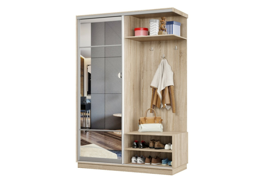 В прихожей используется одна дверь, которая перемещается по однополосному треку вправо или влево, закрывая или открывая каждую из двух частей шкафа.