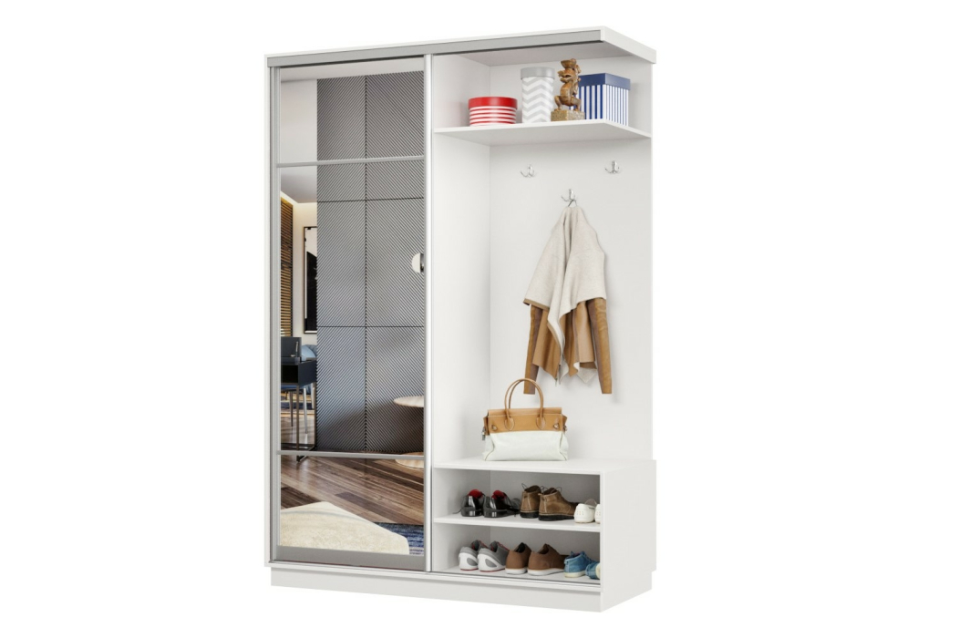 В прихожей используется одна дверь, которая перемещается по однополосному треку вправо или влево, закрывая или открывая каждую из двух частей шкафа.