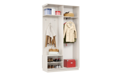 Дверь делит шкаф на 2 равные части: отделение для верхней одежды и отделение с полками и крючками.