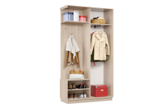 Дверь делит шкаф на 2 равные части: отделение для верхней одежды и отделение с полками и крючками.