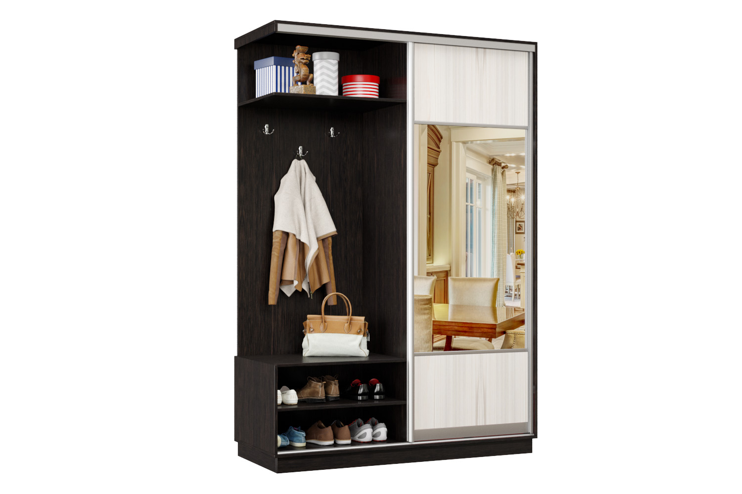 Дверь делит шкаф на 2 равные части: отделение для верхней одежды и отделение с полками и крючками.
