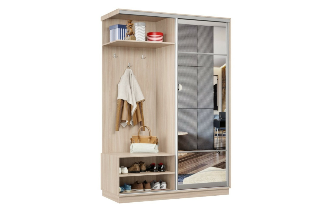 За счет применения системы купе прихожая отлично зарекомендовала себя в узких коридорах, где распашная дверь ограничивает пространство. Несмотря на небольшие габариты, прихожая-купе получилась функциональной и практичной.