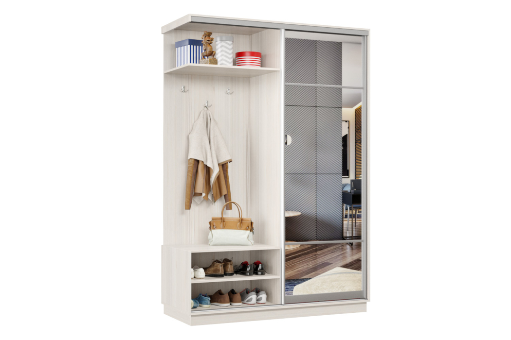 В прихожей используется одна дверь, которая перемещается по однополосному треку вправо или влево, закрывая или открывая каждую из двух частей шкафа.