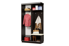 Дверь делит шкаф на 2 равные части: отделение для верхней одежды и отделение с полками и крючками.
