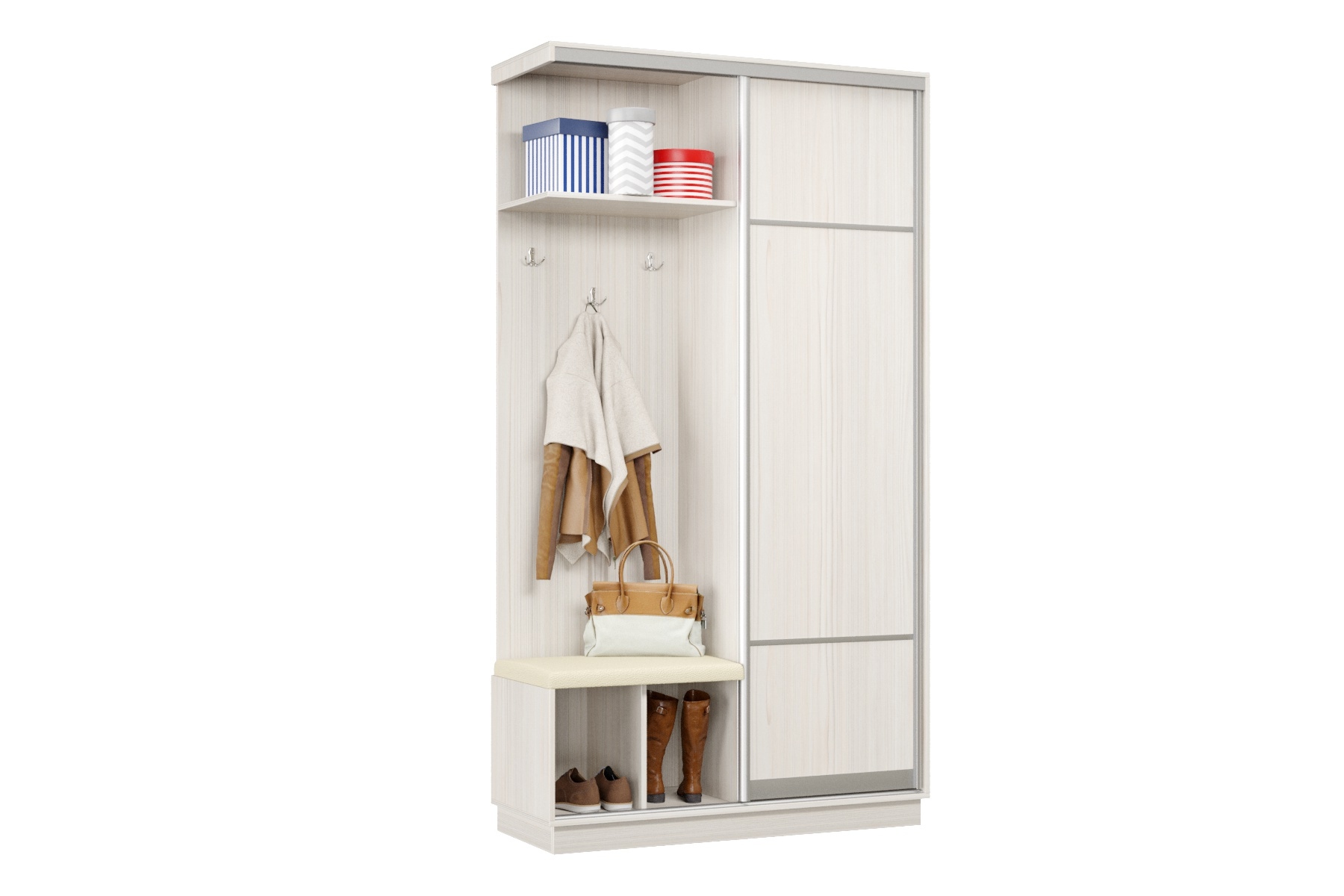 В прихожей используется одна дверь, которая перемещается по однополосному треку вправо или влево, закрывая или открывая каждую из двух частей шкафа.