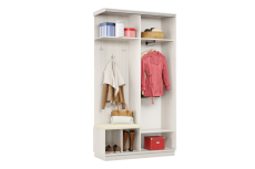 Дверь делит шкаф на 2 равные части: отделение для верхней одежды и отделение с полками и крючками.