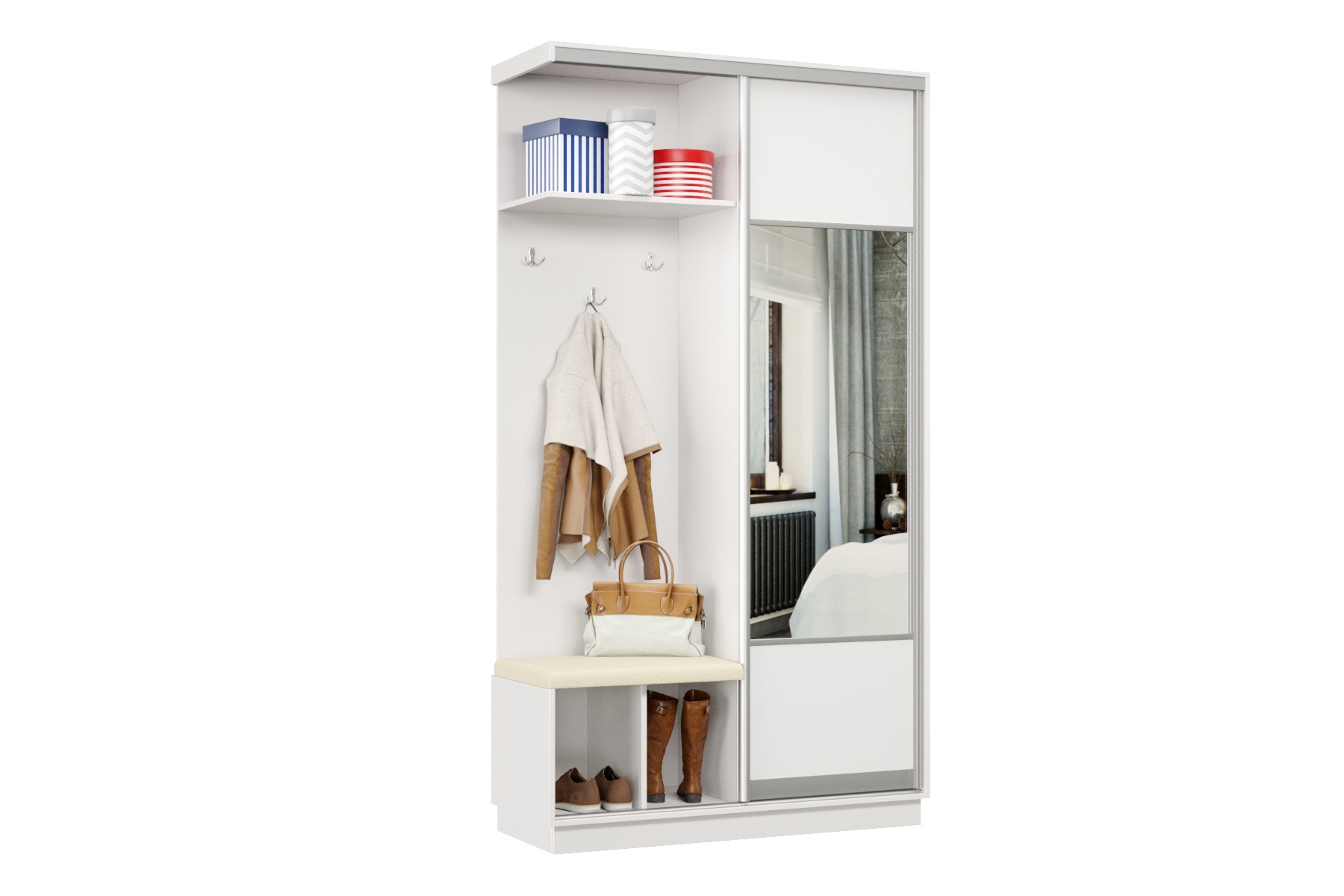 В прихожей используется одна дверь, которая перемещается по однополосному треку вправо или влево, закрывая или открывая каждую из двух частей шкафа.