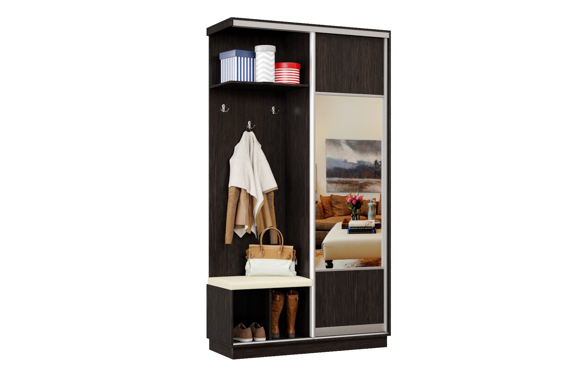 Дверь делит шкаф на 2 равные части: отделение для верхней одежды и отделение с полками и крючками.