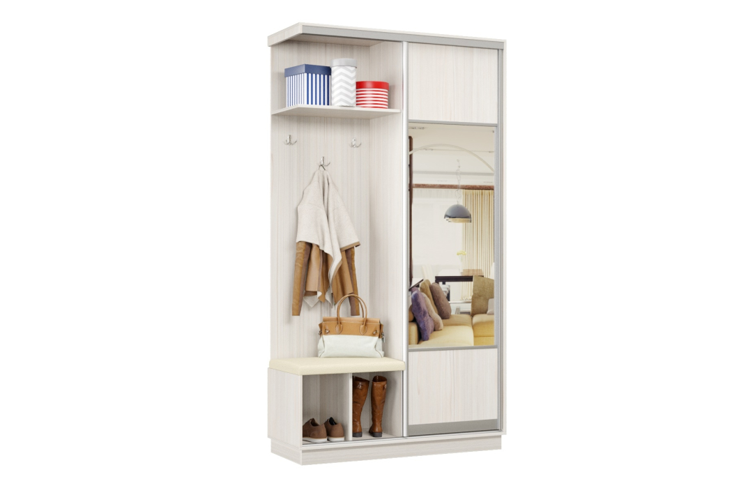 За счет применения системы купе прихожая отлично зарекомендовала себя в узких коридорах, где распашная дверь ограничивает пространство. Несмотря на небольшие габариты, прихожая-купе получилась функциональной и практичной.