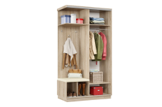 Дверь делит шкаф на 2 равные части: отделение для верхней одежды и отделение с полками и крючками.