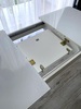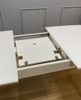 Стол очень удобно раскладывается. Тянешь за одну половинку стола и он сам разъезжается в разные стороны. Удобно делать одному. Внутри спрятана вставка, которая состоит из 2х половинок. Половинки просто откидываются на столешницу и получается ровная и сплошная поверхность. Хорошо, что вставки из того же материала, что и основная столешница, а не дешевая доска как у других столов, которые видели в салонах