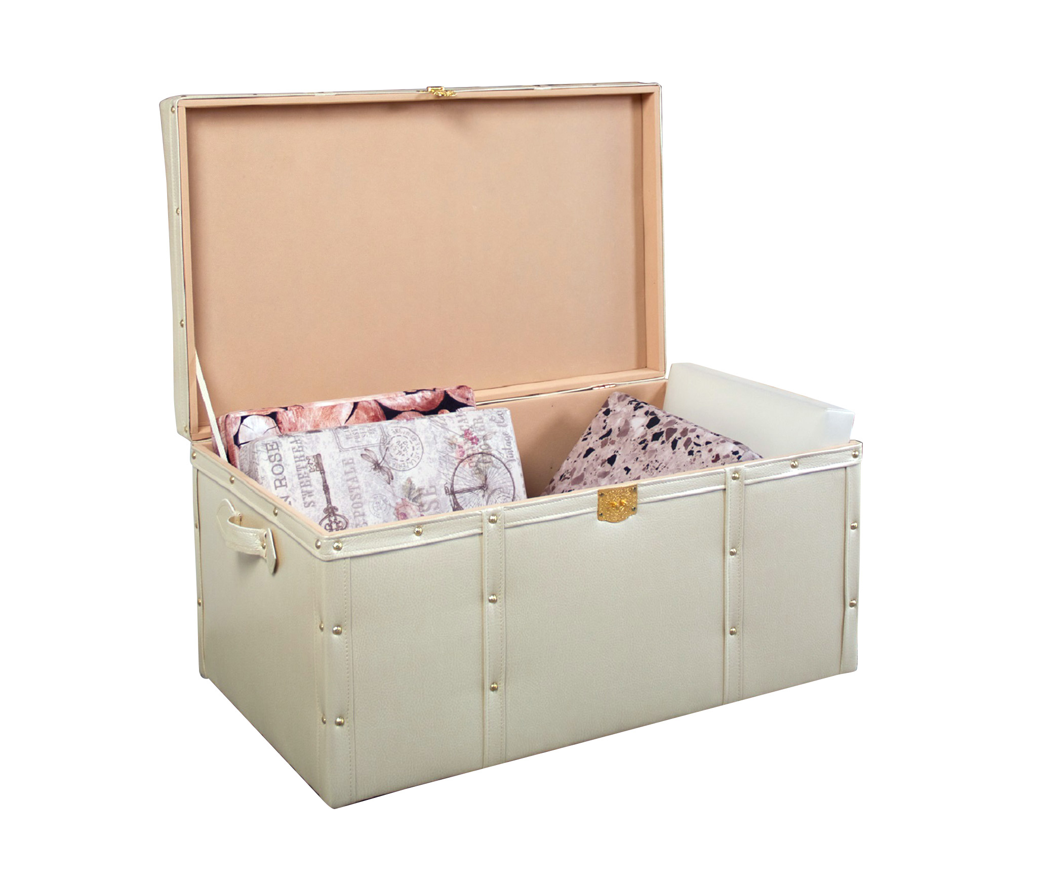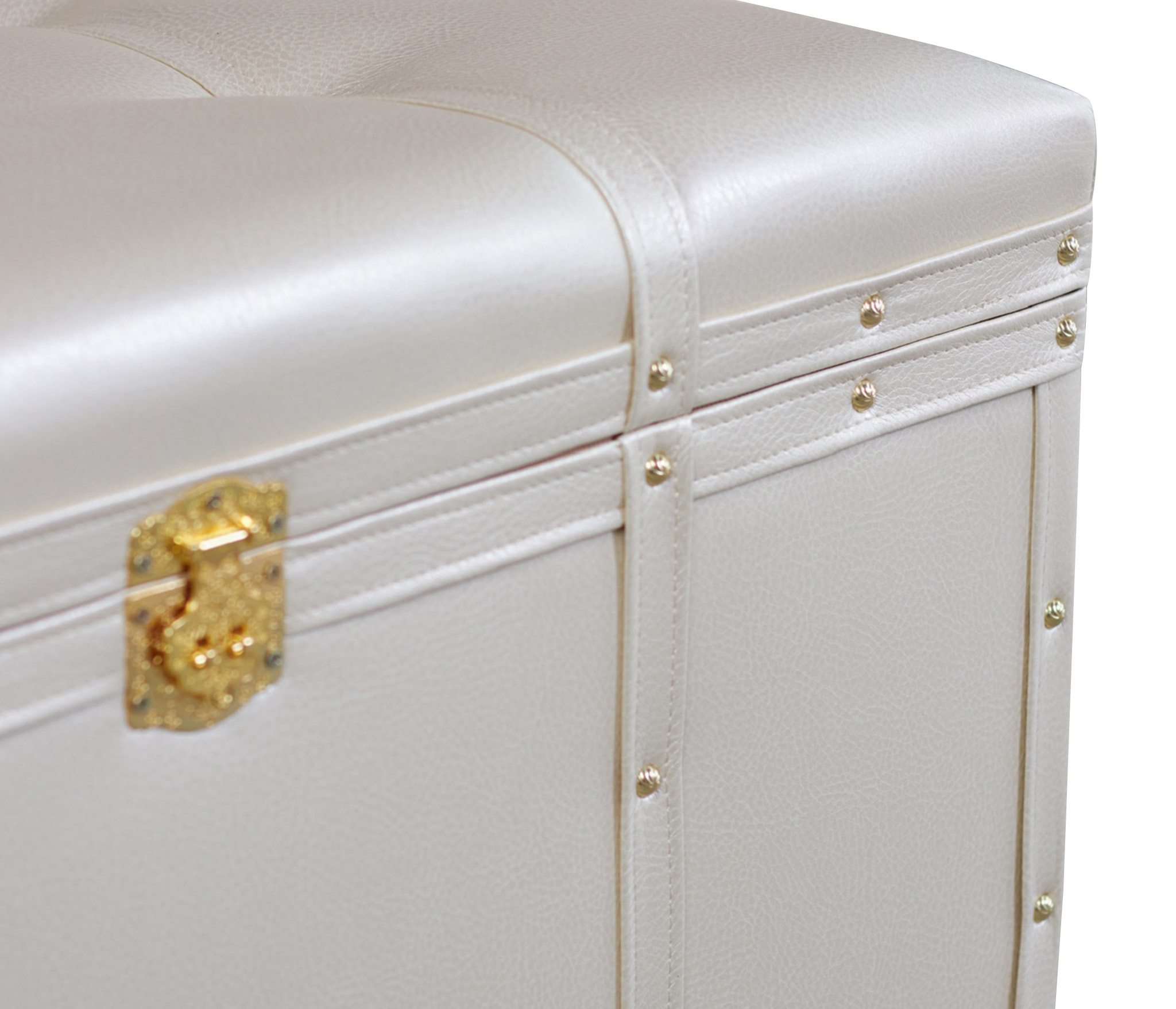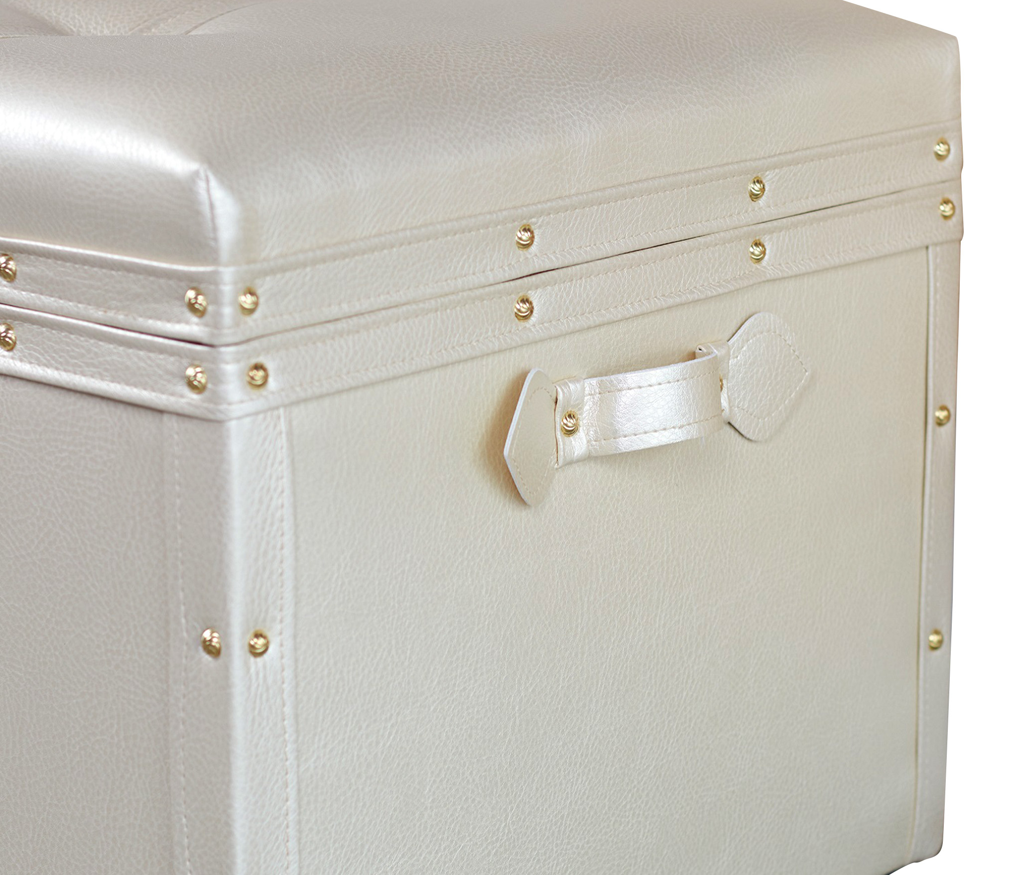 Банкетка ""Жемчужина"" с ящиком для хранения большая представлена в виде напольного сундука в классическом стиле. Пуфик удивительно красив  и функционален: может использоваться и как пуф-банкетка  и как объемный короб для хранения. Используемая для его обивки перламутровая экокожа с лазерным покрытием придаст лоск и шик практически любому интерьеру. Дизайн сундука банкетки выполнен в старинной манере - с ремнями и декоративными золотыми гвоздями и замком. . Сундук стоит на пластиковых ножках. Пуфик подойдет в прихожую, коридор, в спальню, в гостинную, в детскую, в кухню, в зал прекрасно впишется в любой интерьер офиса, дома или дачи. Пуф мягкий идеальный подарок мужчине или женщине на свадьбу, годовщину или юбилей. Подарок любимой, маме, жене, подруге.  Сундук очень удобен в использовании в качестве пуфа или банкетки. Его крышка изготовлена из прочного материала, способного выдерживать большую вертикальную нагрузку до 200кг. Объемное внутреннее пространство банкетки, отделанное  спанбондом, позволяет хранить различные предметы домашнего обихода и вещи. Элегантный пуфик банкетка будет служить местом для сидения и дополнительным местом для хранения. Пуфики удобны в качестве тумбы, прикроватного туалетного столика, полки, обувницы, стула, коробки для хранения. В ящик банкетки можно сложить обувь, книги, игрушки , постельное белье. Пуф с крышкой , банкетки разных цветов , размеров и фактур : большие, высокие, круглые, велюр, из рогожки, на ножках и без, из экокожи, ткани, с каретной стяжкой представлены в нашем магазине.  Банкетку удобно использовать для сидения и в качестве подставки для ног или лежака для животных. Прочный каркас, качественные материалы, эксклюзивный дизайн, стильная обивка не оставят равнодушными взрослых и детей. Наполнитель для пуфа упругий поролон. Такой пуфик-банкетка альтернатива круглому пуфу, бескаркасному пуфу, отличная замена пуфа мешка.