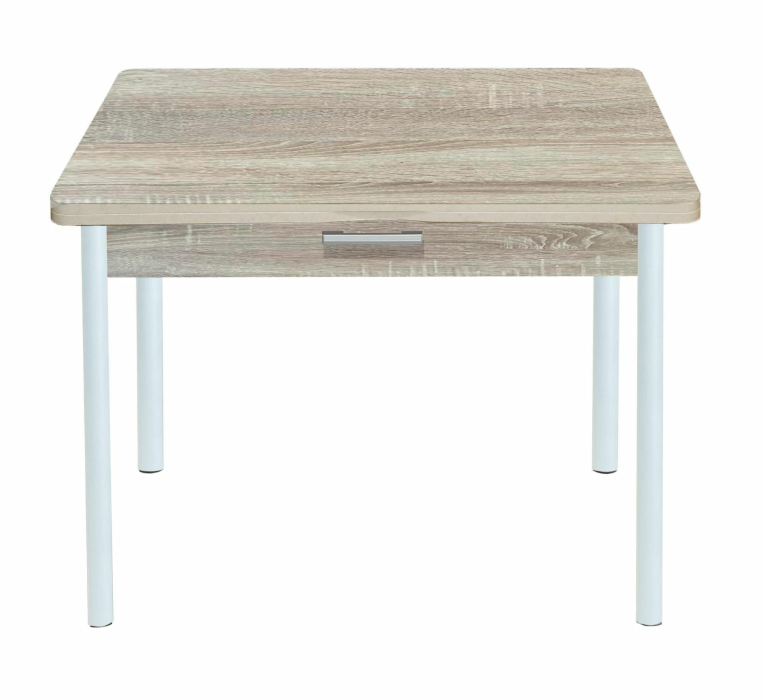Стол изготовлен из ЛДСП высокого качества. Толщина столешницы 16 мм. Стол раскладной с использованием секретных петель. Ножки круглые металлические, покрытые порошковой краской. В столе есть выдвижной ящик.