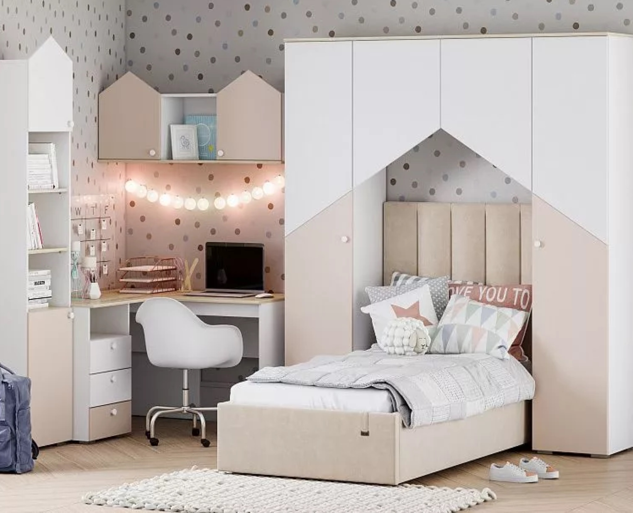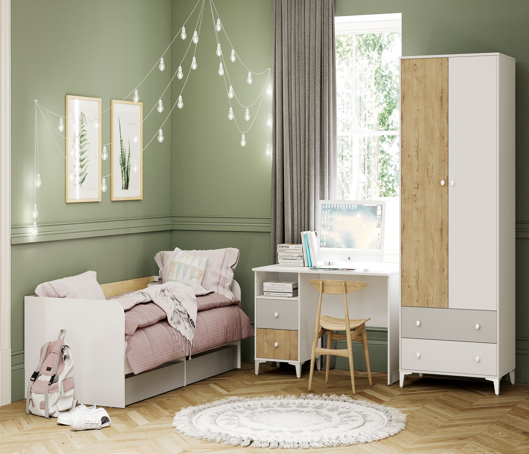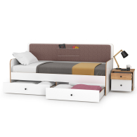 Комплект состоит из удобного диванчика Вуди 11.02 и прикроватной тумбочки Вуди 13.287. Прелестная кровать с ящиками выполнена в виде удобного диванчика - мягкая задняя спинка, скругленные подлокотники из ЛДСП. Спальное место - 900х2000 мм. Основание под матрас (настил ЛДСП 16 мм.) в комплекте. Матрас 900х2000 мм. для кровати приобретается отдельно. Рекомендуемая максимальная высота матраса - 200 мм. Задняя стенка кровати с ящиками Вуди 11.02 изготовлена из практичной, модной ткани - рогожка Savana Latte и декорировано удобными карманчиками для аксессуаров. В основании кровати оборудованы два выдвижных ящика для постельных принадлежностей и личных вещей ребёнка. Ящики достаточно вместительные и установлены на колесные опоры, что обеспечивает им легкое выдвижение. Тумбочка оборудована двумя выдвижными ящиками на шариковых направляющих полного выдвижения, которые обеспечивают длительную и тихую эксплуатацию. Верхний ящик чуть меньше и имеет высоту 12,6 см, нижний 24 см. Корпуса и фасады мебели Вуди изготовлены из экологически чистой ламинированной ДСП 16 мм., торцы окромлены ПХВ плёнкой 0,4 мм. Лицевая фурнитура выполнена из черного пластика. Выдвижные ящики на шариковых направляющих полного выдвижения обеспечивают длительную и тихую эксплуатацию. Изображения молодёжной кровати с ящиками с тумбой Вуди Вы можете найти выше в начале страницы. Молодёжная кровать с ящиками с тумбой Вуди - элементы из набора мебели для молодежной комнаты Вуди.