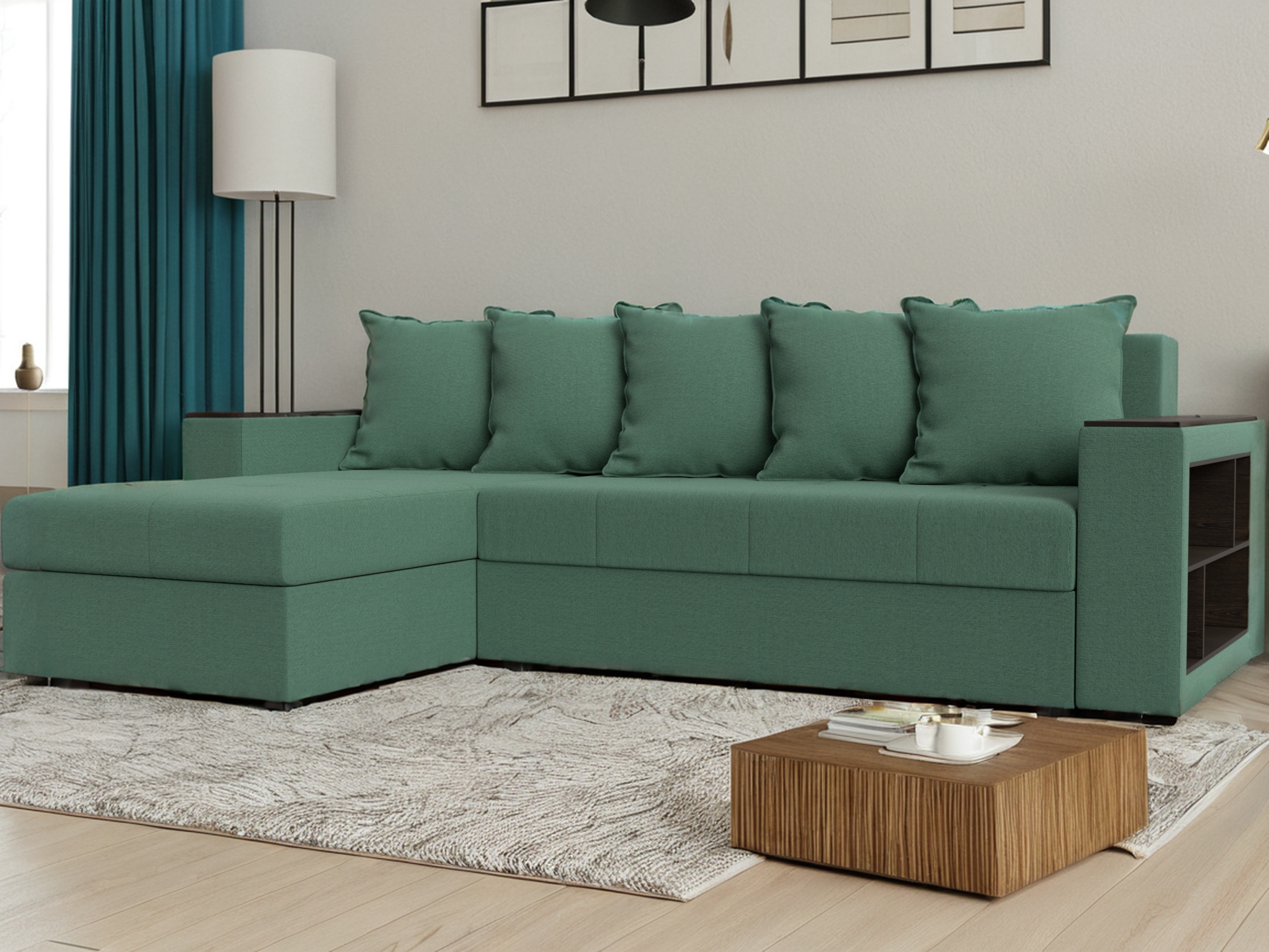 Угловой диван на ножках из серии Дубай Лайт станет функциональным дополнением гостиной. Мягкое сиденье и удобные подлокотники способствуют комфортабельному отдыху. Подлокотники выполняют функцию столика, а удобные боковые полочки.