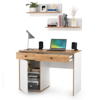 Комплект состоит из стола письменного Вуди 12.42 и двух полкок навесных Вуди 15.46. Вместительная столешница, под ней тумба и выдвижной ящик - есть всё для плодотворной работы. Тумба стола имеет удобное распашное отделение с полкой внутри и ящик над ним. Стол имеет универсальную сборку - сторону расположения тумбы Вы определяете сами при сборке. Открытая навесная полочка с задней панелью в светлых тонах и плавными изгибами станет украшением стены. В комплекте 2 полочки. Разместить на этой полочке можно не только фотографии любимых, а также книги и элементы декора. Корпус и фасады мебели изготовлены из экологически чистой ламинированной ДСП 16 мм., торцы окромлены ПХВ плёнкой 0,4 мм. Лицевая фурнитура выполнена из черного пластика, фасады дверки открывается за вырез по центру. Распашная дверь на четырёхшарнирных петлях без доводчиков, при сборке можно собрать на удобную для Вас сторону открывания. Выдвижные ящики на шариковых направляющих полного выдвижения обеспечивают длительную и тихую эксплуатацию. Поставляется письменный стол Вуди с двумя навесными полками в разобранном виде, надёжно упакованной в гофрокартон, с приложенной подробной инструкцией по сборке. Вы можете купить письменный стол Вуди с двумя навесными полками со скидкой при заказе через сайт в нашем магазине. Изображения письменного стола Вуди с двумя навесными полками Вы можете найти выше в начале страницы. Письменный стол Вуди с двумя навесными полками - элементы из набора мебели для молодежной комнаты Вуди.