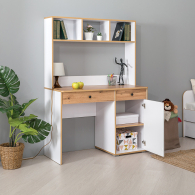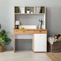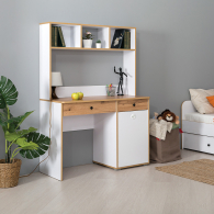 Вместительная столешница, под ней тумба и выдвижной ящик - есть всё для плодотворной работы. Тумба стола имеет удобное распашное отделение с полкой внутри и ящик над ним. Стол имеет универсальную сборку - сторону расположения тумбы Вы определяете сами при сборке. На столещнице расположена надстройка Вуди 13.16. Она представляет из себя классическую надстройку с широкой полкой, разделенной на 3 отделения. В нижней части надстройки имеется дополнительная царга, что делает надстройку более жесткой и надежной. Корпус и фасады мебели изготовлены из экологически чистой ламинированной ДСП 16 мм., торцы окромлены ПХВ плёнкой 0,4 мм. Лицевая фурнитура выполнена из черного пластика, фасады дверки открывается за вырез по центру. Распашная дверь на четырёхшарнирных петлях без доводчиков, при сборке можно собрать на удобную для Вас сторону открывания. Выдвижные ящики на шариковых направляющих полного выдвижения обеспечивают длительную и тихую эксплуатацию. Поставляется письменный стол с надстройкой Вуди в разобранном виде, надёжно упакованной в гофрокартон, с приложенной подробной инструкцией по сборке. Вы можете купить письменный стол с надстройкой Вуди со скидкой при заказе через сайт в нашем магазине. Изображения письменного стола с надстройкой Вуди Вы можете найти выше в начале страницы. Письменный стол с надстройкой Вуди - элементы из набора мебели для молодежной комнаты Вуди.