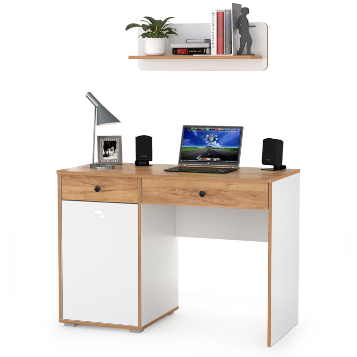 Комплект состоит из стола письменного Вуди 12.42 и полки навесной Вуди 15.46. Вместительная столешница, под ней тумба и выдвижной ящик - есть всё для плодотворной работы. Тумба стола имеет удобное распашное отделение с полкой внутри и ящик над ним. Стол имеет универсальную сборку - сторону расположения тумбы Вы определяете сами при сборке. Открытая навесная полочка с задней панелью в светлых тонах и плавными изгибами станет украшением стены. Разместить на этой полочке можно не только фотографии любимых, а также книги и элементы декора. Корпус и фасады мебели изготовлены из экологически чистой ламинированной ДСП 16 мм., торцы окромлены ПХВ плёнкой 0,4 мм. Лицевая фурнитура выполнена из черного пластика, фасады дверки открывается за вырез по центру. Распашная дверь на четырёхшарнирных петлях без доводчиков, при сборке можно собрать на удобную для Вас сторону открывания. Выдвижные ящики на шариковых направляющих полного выдвижения обеспечивают длительную и тихую эксплуатацию. Поставляется стол письменный Вуди с навесной полкой в разобранном виде, надёжно упакованной в гофрокартон, с приложенной подробной инструкцией по сборке. Вы можете купить стол письменный Вуди с навесной полкой со скидкой при заказе через сайт в нашем магазине. Изображения стола письменного Вуди с навесной полкой Вы можете найти выше в начале страницы. Стол письменный Вуди с навесной полкой - элементы из набора мебели для молодежной комнаты Вуди.