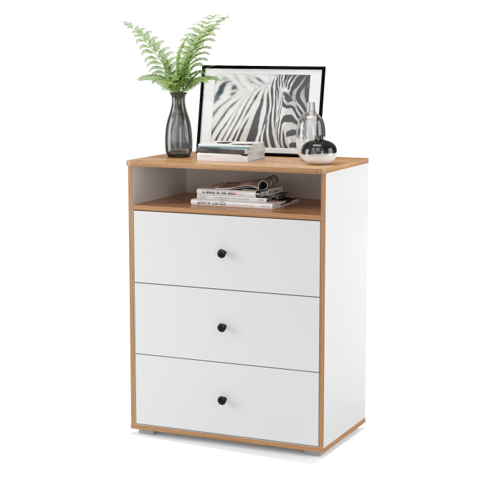 Комод имеет верхнюю открытую нишу и три выдвижных ящика для одежды, вещей, игрушек, документов и всего, что Вы захотите хранить в комоде. Корпус и фасады мебели изготовлены из экологически чистой ламинированной ДСП 16 мм., торцы окромлены ПХВ плёнкой 0,4 мм. Лицевая фурнитура выполнена из черного пластика. Выдвижные ящики на шариковых направляющих полного выдвижения обеспечивают длительную и тихую эксплуатацию. Поставляется комод Вуди 13.293 в разобранном виде, надёжно упакованной в гофрокартон, с приложенной подробной инструкцией по сборке. Вы можете купить комод Вуди 13.293 со скидкой при заказе через сайт в нашем магазине. Изображения комода Вуди 13.293 Вы можете найти выше в начале страницы. Комод Вуди 13.293 - элемент из набора мебели для молодежной комнаты Вуди.