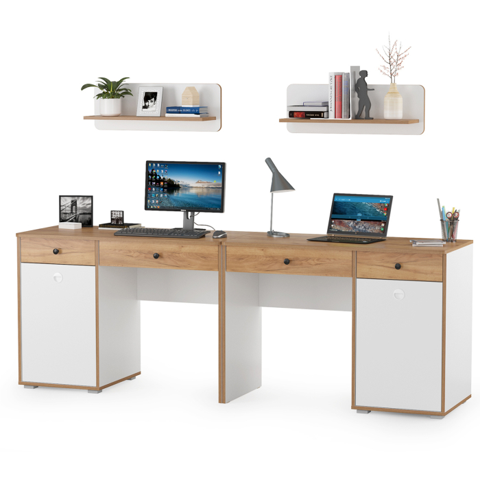 Комплект состоит из двух столов письменных Вуди 12.42 и двух полок навесных Вуди 15.46. Вместительная столешница, под ней тумба и выдвижной ящик - есть всё для плодотворной работы. Тумба стола имеет удобное распашное отделение с полкой внутри и ящик над ним. Стол имеет универсальную сборку - сторону расположения тумбы Вы определяете сами при сборке. Открытая навесная полочка с задней панелью в светлых тонах и плавными изгибами станет украшением стены. В комплекте 2 полочки. Разместить на этой полочке можно не только фотографии любимых, а также книги и элементы декора. Корпуса и фасады мебели изготовлены из экологически чистой ламинированной ДСП 16 мм., торцы окромлены ПХВ плёнкой 0,4 мм. Лицевая фурнитура выполнена из черного пластика, фасады дверки открывается за вырез по центру. Распашные двери на четырёхшарнирных петлях без доводчиков, при сборке можно собрать на удобную для Вас сторону открывания. Выдвижные ящики на шариковых направляющих полного выдвижения обеспечивают длительную и тихую эксплуатацию. Поставляются письменные столы с навесными полками для двоих детей Вуди в разобранном виде, надёжно упакованной в гофрокартон, с приложенной подробной инструкцией по сборке. Письменные столы с навесными полками для двоих детей Вуди - элементы из набора мебели для молодежной комнаты Вуди.