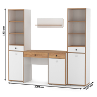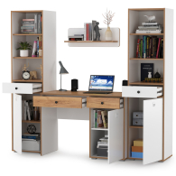 Комплект Вуди № 08 состоит из стола компьютерного Вуди 12.42, двух пеналов Вуди 13.146 и открытой полки Вуди 15.46. Вместительная столешница, под ней тумба и выдвижной ящик - есть всё для плодотворной работы. Тумба стола имеет удобное распашное отделение с полкой внутри и ящик над ним. Стол имеет универсальную сборку - сторону расположения тумбы Вы определяете сами при сборке. Пенал оборудован в верхней части двумя полками, по центру выдвижным ящиком и снизу распашной дверкой с полочкой за ней. В комплекте 2 пенала. Открытая навесная полочка с задней панелью в светлых тонах и плавными изгибами станет украшением стены. Разместить на этой полочке можно не только фотографии любимых, а также книги и элементы декора. Корпуса и фасады мебели изготовлены из экологически чистой ламинированной ДСП 16 мм., торцы окромлены ПХВ плёнкой 0,4 мм. Лицевая фурнитура выполнена из черного пластика, фасады дверки открывается за вырез по центру. Распашные двери на четырёхшарнирных петлях без доводчиков, при сборке можно собрать на удобную для Вас сторону открывания. Выдвижные ящики на шариковых направляющих полного выдвижения обеспечивают длительную и тихую эксплуатацию. Изображения стола компьютерного Вуди с навесной полкой и двух пеналов Вы можете найти выше в начале страницы. Стол компьютерный Вуди с навесной полкой и два пенала - элементы из набора мебели для молодежной комнаты Вуди.