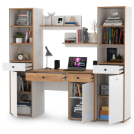 Комплект Вуди № 09 состоит из стола компьютерного Вуди 12.42, двух пеналов Вуди 13.146 и двух открытых полок Вуди 15.46. Вместительная столешница, под ней тумба и выдвижной ящик - есть всё для плодотворной работы. Тумба стола имеет удобное распашное отделение с полкой внутри и ящик над ним. Стол имеет универсальную сборку - сторону расположения тумбы Вы определяете сами при сборке. Пенал оборудован в верхней части двумя полками, по центру выдвижным ящиком и снизу распашной дверкой с полочкой за ней. В комплекте 2 пенала. Открытая навесная полочка с задней панелью в светлых тонах и плавными изгибами станет украшением стены. В комплекте 2 полки. Разместить на этой полочке можно не только фотографии любимых, а также книги и элементы декора. Корпуса и фасады мебели изготовлены из экологически чистой ламинированной ДСП 16 мм., торцы окромлены ПХВ плёнкой 0,4 мм. Лицевая фурнитура выполнена из черного пластика, фасады дверки открывается за вырез по центру. Распашные двери на четырёхшарнирных петлях без доводчиков, при сборке можно собрать на удобную для Вас сторону открывания. Выдвижные ящики на шариковых направляющих полного выдвижения обеспечивают длительную и тихую эксплуатацию. Изображения компьютерного стола с двумя полками и двумя пеналами Вуди Вы можете найти выше в начале страницы. Компьютерный стол с двумя полками и двумя пеналами Вуди - элементы из набора мебели для молодежной комнаты Вуди.