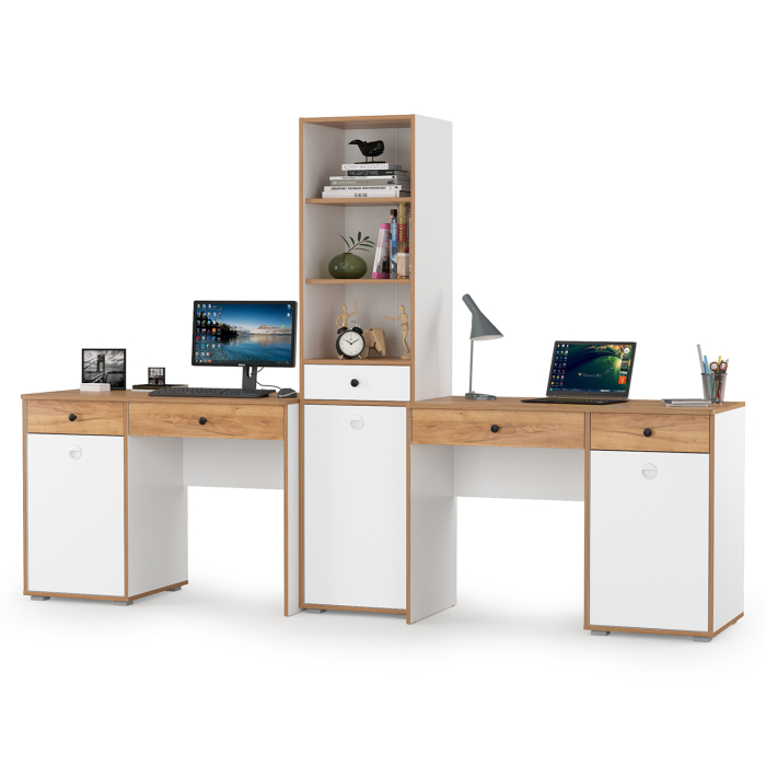 Комплект Вуди состоит из двух компьютерных столов Вуди 12.42 и пенала Вуди 13.146. Вместительная столешница, под ней тумба и выдвижной ящик - есть всё для плодотворной работы. Тумба стола имеет удобное распашное отделение с полкой внутри и ящик над ним. Стол имеет универсальную сборку - сторону расположения тумбы Вы определяете сами при сборке. Пенал оборудован в верхней части двумя полками, по центру выдвижным ящиком и снизу распашной дверкой с полочкой за ней. Корпуса и фасады мебели изготовлены из экологически чистой ламинированной ДСП 16 мм., торцы окромлены ПХВ плёнкой 0,4 мм. Лицевая фурнитура выполнена из черного пластика, фасады дверки открывается за вырез по центру. Распашные двери на четырёхшарнирных петлях без доводчиков, при сборке можно собрать на удобную для Вас сторону открывания. Выдвижные ящики на шариковых направляющих полного выдвижения обеспечивают длительную и тихую эксплуатацию. Изображения компьютерных столов Вуди с пеналом для двоих детей Вы можете найти выше в начале страницы. Компьютерные столы Вуди с пеналом для двоих детей - элемент из набора мебели для молодежной комнаты Вуди.