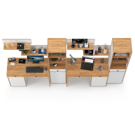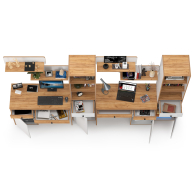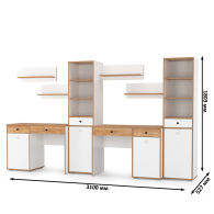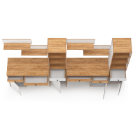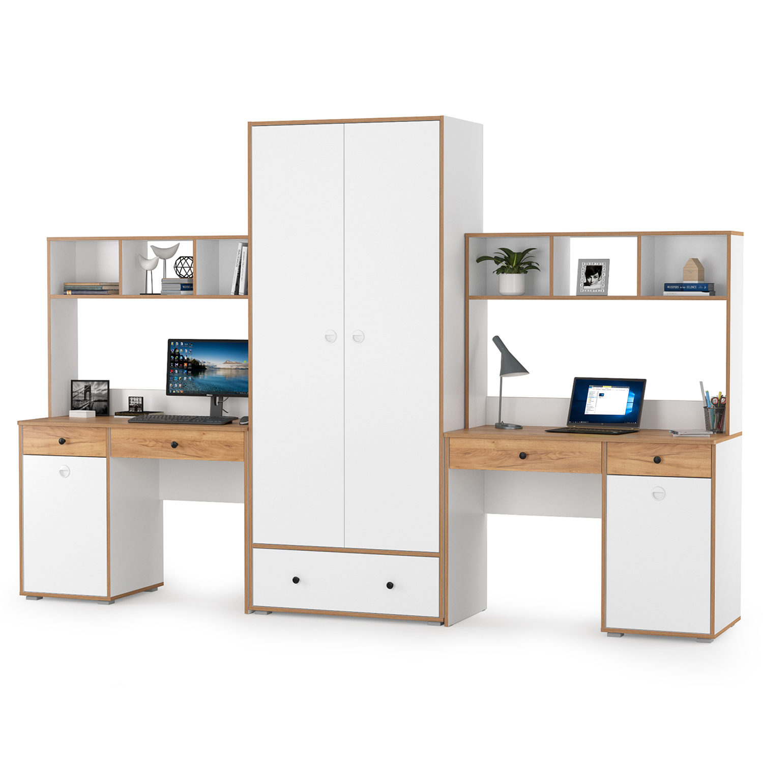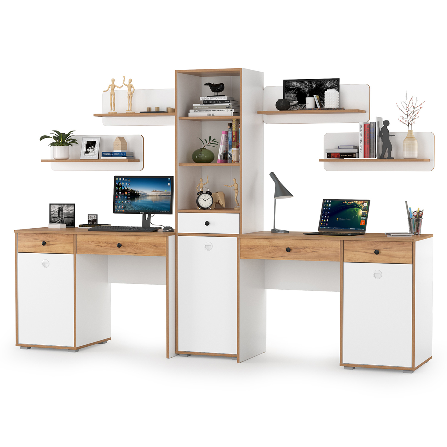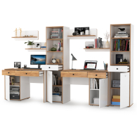 Комплектация состоит из двух столов письменных, четырех навесных полок и двух пеналов. В комплектации 2 стола. Вместительная столешница, под ней тумба и выдвижной ящик - есть всё для плодотворной работы. Тумба стола имеет удобное распашное отделение с полкой внутри и ящик над ним. Стол имеет универсальную сборку - сторону расположения тумбы Вы определяете сами при сборке. Пенал (в комплектации 2 шт.) оборудован в верхней части двумя полками, по центру выдвижным ящиком и снизу распашной дверкой с полочкой за ней. Открытая навесная полочка (в комплектации 4 шт.) с задней панелью в светлых тонах и плавными изгибами станет украшением стены. Разместить на этой полочке можно не только фотографии любимых, а также книги и элементы декора. Корпуса и фасады мебели изготовлены из экологически чистой ламинированной ДСП 16 мм., торцы окромлены ПХВ плёнкой 0,4 мм. Лицевая фурнитура выполнена из черного пластика, фасады дверки открывается за вырез по центру. Распашные двери на четырёхшарнирных петлях без доводчиков, при сборке можно собрать на удобную для Вас сторону открывания. Выдвижные ящики на шариковых направляющих полного выдвижения обеспечивают длительную и тихую эксплуатацию. Изображения мебели в детскую для двоих детей Вуди компоновка № 16 Вы можете найти выше в начале страницы. Мебель в детскую для двоих детей Вуди компоновка № 16 - элементы из набора мебели для молодежной комнаты Вуди.