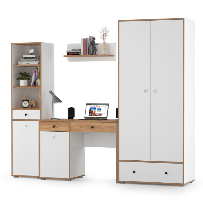 Комплектация состоит из стола письменного Вуди 12.42, навесной полки Вуди 15.46, пенала Вуди 13.146 и шкафа для одежды Вуди 13.138. Вместительная столешница, под ней тумба и выдвижной ящик - есть всё для плодотворной работы. Тумба стола имеет удобное распашное отделение с полкой внутри и ящик над ним. Стол имеет универсальную сборку - сторону расположения тумбы Вы определяете сами при сборке. За распашными дверками шкафа оборудовано отделение с антресольной полкой и горизонтальной штангой для одежды на вешалках, снизу вместительный выдвижной ящик. Пенал оборудован в верхней части двумя полками, по центру выдвижным ящиком и снизу распашной дверкой с полочкой за ней. Открытая навесная полочка с задней панелью в светлых тонах и плавными изгибами станет украшением стены. Разместить на этой полочке можно не только фотографии любимых, а также книги и элементы декора. Корпуса и фасады мебели изготовлены из экологически чистой ламинированной ДСП 16 мм., торцы окромлены ПХВ плёнкой 0,4 мм. Лицевая фурнитура выполнена из черного пластика, фасады дверки открывается за вырез по центру. Распашные двери на четырёхшарнирных петлях без доводчиков, при сборке можно собрать на удобную для Вас сторону открывания. Выдвижные ящики на шариковых направляющих полного выдвижения обеспечивают длительную и тихую эксплуатацию. Изображения молодёжной мебельной стенки Вуди № 22 Вы можете найти выше в начале страницы. Молодёжная мебельная стенка Вуди № 22 - элементы из набора мебели для молодежной комнаты Вуди.