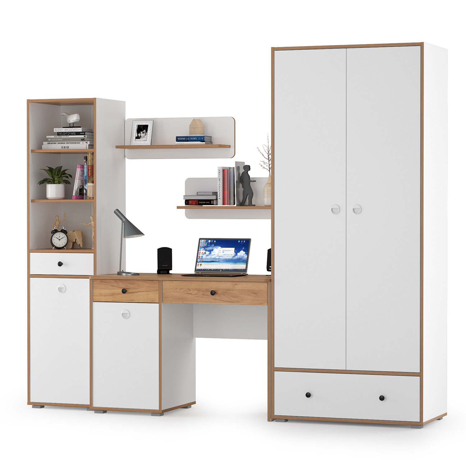 Комплектация состоит из стола письменного Вуди 12.42, двух навесных полок Вуди 15.46, пенала Вуди 13.146 и шкафа для одежды Вуди 13.138. В комплектации 2 стола. Вместительная столешница, под ней тумба и выдвижной ящик - есть всё для плодотворной работы. Тумба стола имеет удобное распашное отделение с полкой внутри и ящик над ним. Стол имеет универсальную сборку - сторону расположения тумбы Вы определяете сами при сборке. За распашными дверками шкафа оборудовано отделение с антресольной полкой и горизонтальной штангой для одежды на вешалках, снизу вместительный выдвижной ящик. Пенал оборудован в верхней части двумя полками, по центру выдвижным ящиком и снизу распашной дверкой с полочкой за ней. Открытая навесная полочка (в комплектации 2 шт.) с задней панелью в светлых тонах и плавными изгибами станет украшением стены. Разместить на этой полочке можно не только фотографии любимых, а также книги и элементы декора. Корпуса и фасады мебели изготовлены из экологически чистой ламинированной ДСП 16 мм., торцы окромлены ПХВ плёнкой 0,4 мм. Лицевая фурнитура выполнена из черного пластика, фасады дверки открывается за вырез по центру. Распашные двери на четырёхшарнирных петлях без доводчиков, при сборке можно собрать на удобную для Вас сторону открывания. Выдвижные ящики на шариковых направляющих полного выдвижения обеспечивают длительную и тихую эксплуатацию. Изображения мебельной стенки в молодёжную комнату Вуди № 23 Вы можете найти выше в начале страницы. Мебельная стенка в молодёжную комнату Вуди № 23 - элементы из набора мебели для молодежной комнаты Вуди.