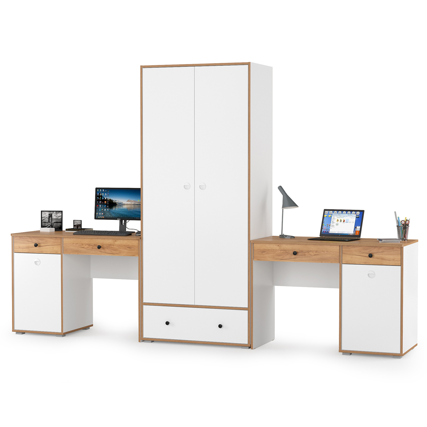 Комплектация состоит из двух столов письменных Вуди 12.42 и шкафа для одежды Вуди 13.138. В комплектации 2 стола. Вместительная столешница, под ней тумба и выдвижной ящик - есть всё для плодотворной работы. Тумба стола имеет удобное распашное отделение с полкой внутри и ящик над ним. Стол имеет универсальную сборку - сторону расположения тумбы Вы определяете сами при сборке. За распашными дверками шкафа оборудовано отделение с антресольной полкой и горизонтальной штангой для одежды на вешалках, снизу вместительный выдвижной ящик. Корпуса и фасады мебели изготовлены из экологически чистой ламинированной ДСП 16 мм., торцы окромлены ПХВ плёнкой 0,4 мм. Лицевая фурнитура выполнена из черного пластика, фасады дверки открывается за вырез по центру. Распашные двери на четырёхшарнирных петлях без доводчиков, при сборке можно собрать на удобную для Вас сторону открывания. Выдвижные ящики на шариковых направляющих полного выдвижения обеспечивают длительную и тихую эксплуатацию. Изображения двух письменных столов и шкафа Вуди Вы можете найти выше в начале страницы. Два письменных стола и шкаф Вуди - элементы из набора мебели для молодежной комнаты Вуди.