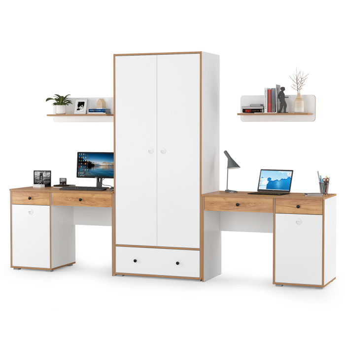 Комплектация состоит из двух столов письменных Вуди 12.42, двух навесных полок Вуди 15.46 и шкафа для одежды Вуди 13.138. В комплектации 2 стола. Вместительная столешница, под ней тумба и выдвижной ящик - есть всё для плодотворной работы. Тумба стола имеет удобное распашное отделение с полкой внутри и ящик над ним. Стол имеет универсальную сборку - сторону расположения тумбы Вы определяете сами при сборке. За распашными дверками шкафа оборудовано отделение с антресольной полкой и горизонтальной штангой для одежды на вешалках, снизу вместительный выдвижной ящик. В комплектации 2 полочки. Открытая навесная полочка с задней панелью в светлых тонах и плавными изгибами станет украшением стены. Разместить на этой полочке можно не только фотографии любимых, а также книги и элементы декора. Корпуса и фасады мебели изготовлены из экологически чистой ламинированной ДСП 16 мм., торцы окромлены ПХВ плёнкой 0,4 мм. Лицевая фурнитура выполнена из черного пластика, фасады дверки открывается за вырез по центру. Распашные двери на четырёхшарнирных петлях без доводчиков, при сборке можно собрать на удобную для Вас сторону открывания. Выдвижные ящики на шариковых направляющих полного выдвижения обеспечивают длительную и тихую эксплуатацию. Поставляется письменный стол Вуди и платяной шкаф в разобранном виде, надёжно упакованной в гофрокартон, с приложенной подробной инструкцией по сборке. Изображения двух столов для учёбы, шкаф и две открытых полки Вуди Вы можете найти выше в начале страницы. Два стола для учёбы, шкаф и две открытых полки Вуди - элементы из набора мебели для молодежной комнаты Вуди.