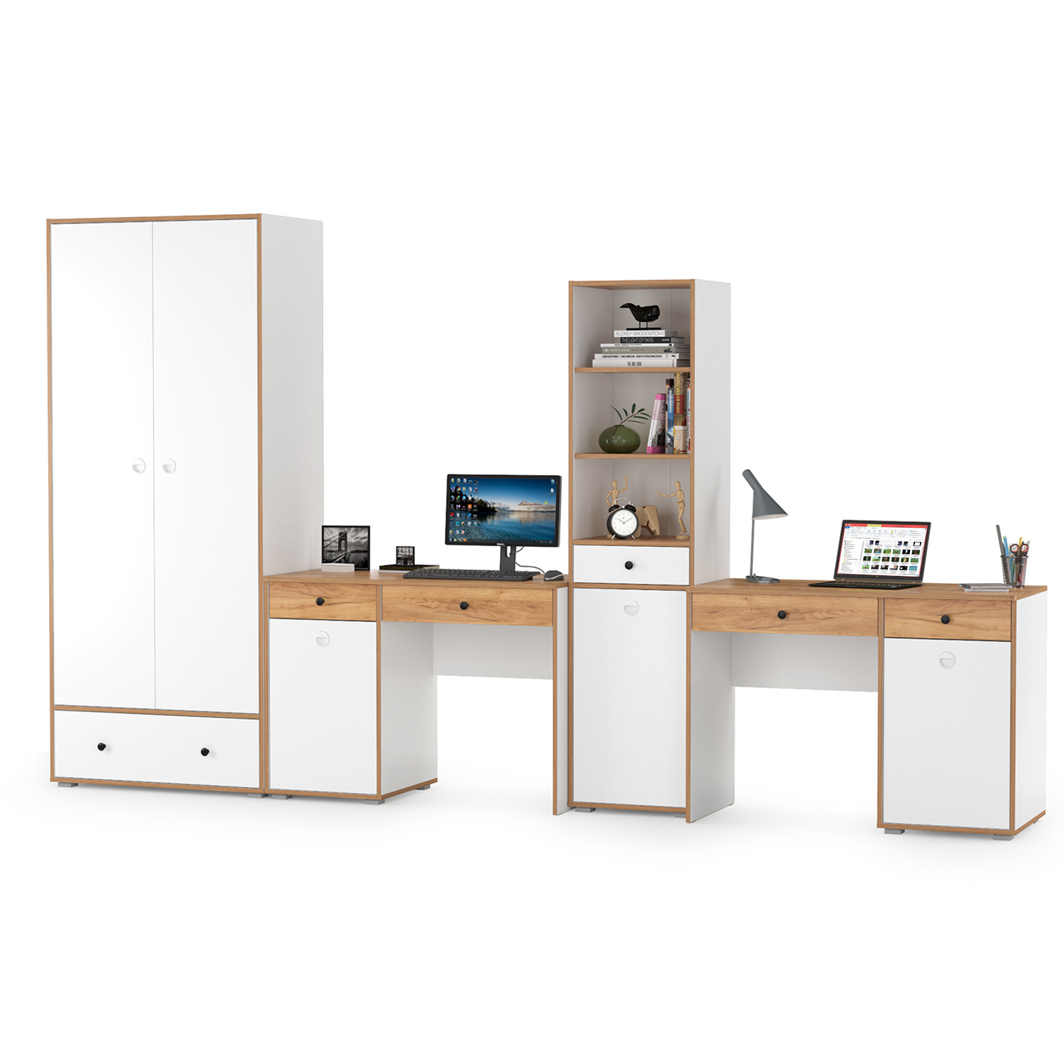 Комплектация состоит из двух столов письменных Вуди 12.42, пенала Вуди 13.146 и шкафа для одежды Вуди 13.138. В комплектации 2 стола. Вместительная столешница, под ней тумба и выдвижной ящик - есть всё для плодотворной работы. Тумба стола имеет удобное распашное отделение с полкой внутри и ящик над ним. Стол имеет универсальную сборку - сторону расположения тумбы Вы определяете сами при сборке. За распашными дверками шкафа оборудовано отделение с антресольной полкой и горизонтальной штангой для одежды на вешалках, снизу вместительный выдвижной ящик. Пенал оборудован в верхней части двумя полками, по центру выдвижным ящиком и снизу распашной дверкой с полочкой за ней. Корпуса и фасады мебели изготовлены из экологически чистой ламинированной ДСП 16 мм., торцы окромлены ПХВ плёнкой 0,4 мм. Лицевая фурнитура выполнена из черного пластика, фасады дверки открывается за вырез по центру. Распашные двери на четырёхшарнирных петлях без доводчиков, при сборке можно собрать на удобную для Вас сторону открывания. Выдвижные ящики на шариковых направляющих полного выдвижения обеспечивают длительную и тихую эксплуатацию. Изображения мебели в детскую комнату для двоих детей Вуди № 29 Вы можете найти выше в начале страницы. Мебель в детскую комнату для двоих детей Вуди № 29 - элементы из набора мебели для молодежной комнаты Вуди.