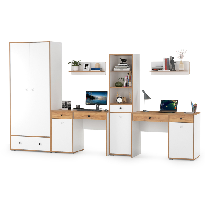 Комплектация состоит из двух столов письменных Вуди 12.42, двух навесных полок Вуди 15.46, пенала Вуди 13.146 и шкафа для одежды Вуди 13.138. В комплектации 2 стола. Вместительная столешница, под ней тумба и выдвижной ящик - есть всё для плодотворной работы. Тумба стола имеет удобное распашное отделение с полкой внутри и ящик над ним. Стол имеет универсальную сборку - сторону расположения тумбы Вы определяете сами при сборке. За распашными дверками шкафа оборудовано отделение с антресольной полкой и горизонтальной штангой для одежды на вешалках, снизу вместительный выдвижной ящик. Пенал оборудован в верхней части двумя полками, по центру выдвижным ящиком и снизу распашной дверкой с полочкой за ней. Открытая навесная полочка (в комплектации 2 шт.) с задней панелью в светлых тонах и плавными изгибами станет украшением стены. Разместить на этой полочке можно не только фотографии любимых, а также книги и элементы декора. Корпуса и фасады мебели изготовлены из экологически чистой ламинированной ДСП 16 мм., торцы окромлены ПХВ плёнкой 0,4 мм. Лицевая фурнитура выполнена из черного пластика, фасады дверки открывается за вырез по центру. Распашные двери на четырёхшарнирных петлях без доводчиков, при сборке можно собрать на удобную для Вас сторону открывания. Выдвижные ящики на шариковых направляющих полного выдвижения обеспечивают длительную и тихую эксплуатацию. Изображения мебели для детской комнаты для двоих детей Вуди № 30 Вы можете найти выше в начале страницы. Мебель для детской комнаты для двоих детей Вуди № 30 - элементы из набора мебели для молодежной комнаты Вуди.