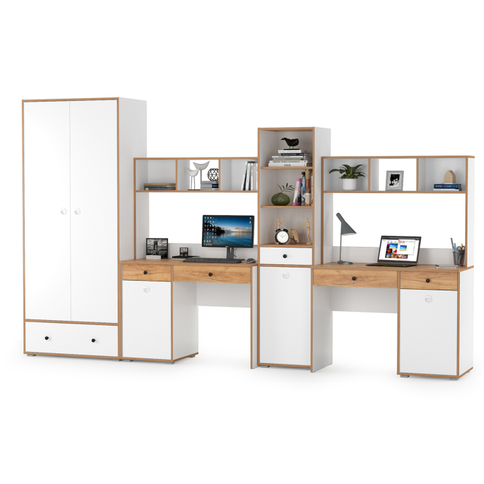 Комплектация состоит из двух столов письменных Вуди 12.42 с двумя надстройками Вуди 13.161, пенала Вуди 13.146 и шкафа для одежды Вуди 13.138. В комплектации 2 стола. Вместительная столешница, под ней тумба и выдвижной ящик. Тумба стола имеет удобное распашное отделение с полкой внутри и ящик над ним. На столещницах расположены надстройки. Стол имеет универсальную сборку - сторону расположения тумбы Вы определяете сами при сборке. За распашными дверками шкафа оборудовано отделение с антресольной полкой и штангой для одежды на вешалках, снизу вместительный ящик. Пенал оборудован 2 полками, ящиком и снизу распашной дверкой с полочкой за ней. Лицевая фурнитура выполнена из черного пластика, фасады дверки открывается за вырез по центру. Распашные двери на четырёхшарнирных петлях без доводчиков, при сборке можно собрать на удобную для Вас сторону открывания. Выдвижные ящики на шариковых направляющих полного выдвижения обеспечивают длительную и тихую эксплуатацию. Поставляется в разобранном виде в надёжной упаковке, с комплектом сборочной фурнитуры и инструкцией по сборке.