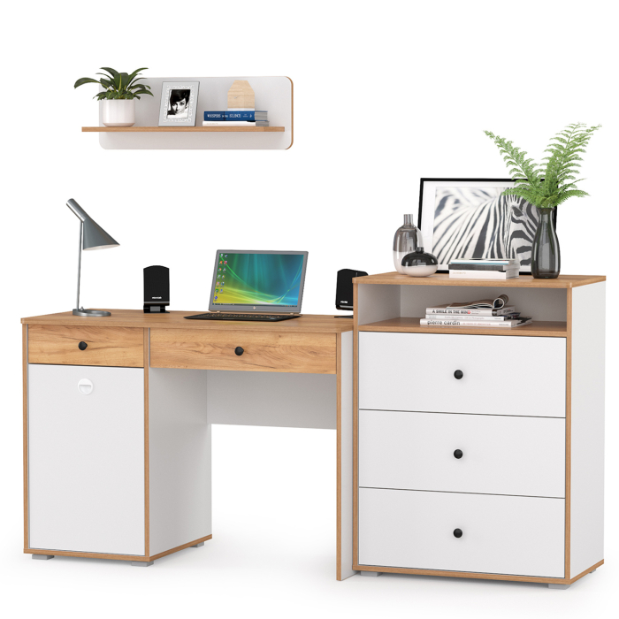 Комплект состоит из стола письменного Вуди 12.42, комода Вуди 13.293 и открытой полки Вуди 15.46. Вместительная столешница, под ней тумба и выдвижной ящик - есть всё для плодотворной работы. Тумба стола имеет удобное распашное отделение с полкой внутри и ящик над ним. Стол имеет универсальную сборку - сторону расположения тумбы Вы определяете сами при сборке. Комод имеет верхнюю открытую нишу и три выдвижных ящика для одежды, вещей, игрушек, документов и всего, что Вы захотите хранить в комоде. Открытая навесная полочка с задней панелью в светлых тонах и плавными изгибами станет украшением стены. Разместить на этой полочке можно не только фотографии любимых, а также книги и элементы декора. Корпуса и фасады мебели изготовлены из экологически чистой ламинированной ДСП 16 мм., торцы окромлены ПХВ плёнкой 0,4 мм. Лицевая фурнитура выполнена из черного пластика, фасады дверки открывается за вырез по центру. Распашные двери на четырёхшарнирных петлях без доводчиков, при сборке можно собрать на удобную для Вас сторону открывания. Выдвижные ящики на шариковых направляющих полного выдвижения обеспечивают длительную и тихую эксплуатацию. Поставляется стол письменный с комодом и навесной полкой Вуди в разобранном виде, надёжно упакованной в гофрокартон, с приложенной подробной инструкцией по сборке. Стол письменный с комодом и навесной полкой Вуди - элементы из набора мебели для молодежной комнаты Вуди.