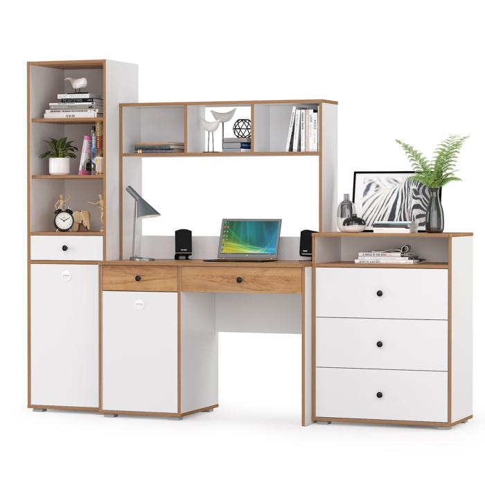 Комплект состоит из стола компьютерного Вуди 12.42 с надстройкой Вуди 13.161, стеллажа Вуди 13.146 и комода Вуди 13.293. Вместительная столешница, под ней тумба и выдвижной ящик - есть всё для плодотворной работы. Тумба стола имеет удобное распашное отделение с полкой внутри и ящик над ним. Стол имеет универсальную сборку - сторону расположения тумбы Вы определяете сами при сборке. На столещнице расположена надстройка Вуди 13.16. Она представляет из себя классическую надстройку с широкой полкой, разделенной на 3 отделения. В нижней части надстройки имеется дополнительная царга, что делает надстройку более жесткой и надежной. Комод имеет верхнюю открытую нишу и три выдвижных ящика для одежды, вещей, игрушек, документов и всего, что Вы захотите хранить в комоде. Стеллаж оборудован в верхней части двумя полками, по центру выдвижным ящиком и снизу распашной дверкой с полочкой за ней. Корпус и фасады мебели изготовлены из экологически чистой ламинированной ДСП 16 мм., торцы окромлены ПХВ плёнкой 0,4 мм. Лицевая фурнитура выполнена из черного пластика, фасады дверки открывается за вырез по центру. Распашная дверь на четырёхшарнирных петлях без доводчиков, при сборке можно собрать на удобную для Вас сторону открывания. Выдвижные ящики на шариковых направляющих полного выдвижения обеспечивают длительную и тихую эксплуатацию. Изображения компьютерного стола, стеллажа и комода с нишей Вуди № 50 Вы можете найти выше в начале страницы. Компьютерный стол, стеллаж и комод с нишей Вуди № 50 - элементы из набора мебели для молодежной комнаты Вуди.