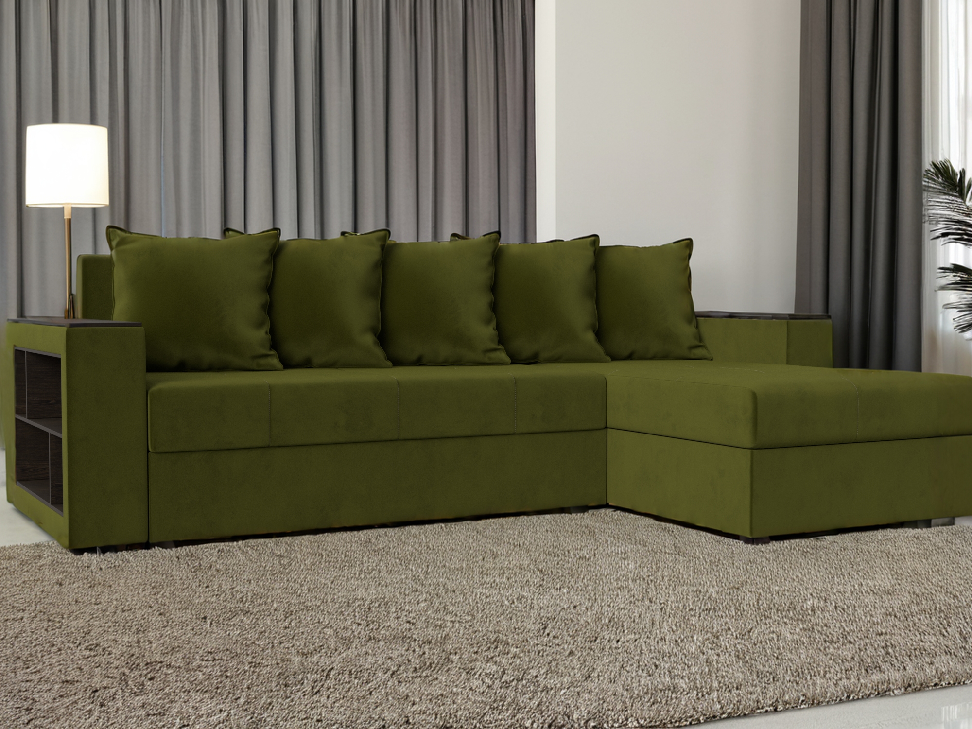 Угловой диван на ножках из серии Дубай Лайт станет функциональным дополнением гостиной. Мягкое сиденье и удобные подлокотники способствуют комфортабельному отдыху. Подлокотники выполняют функцию столика, а удобные боковые полочки.