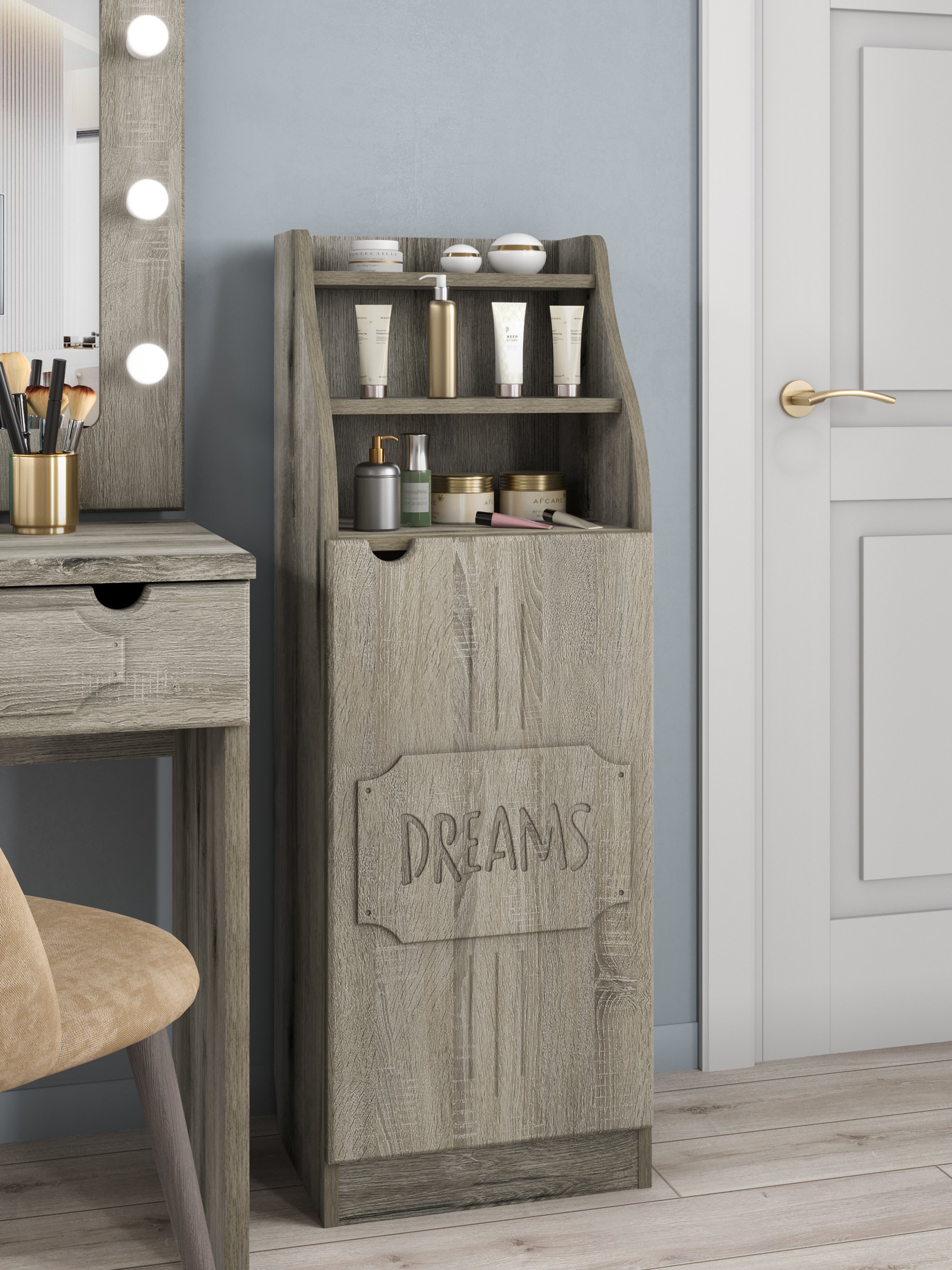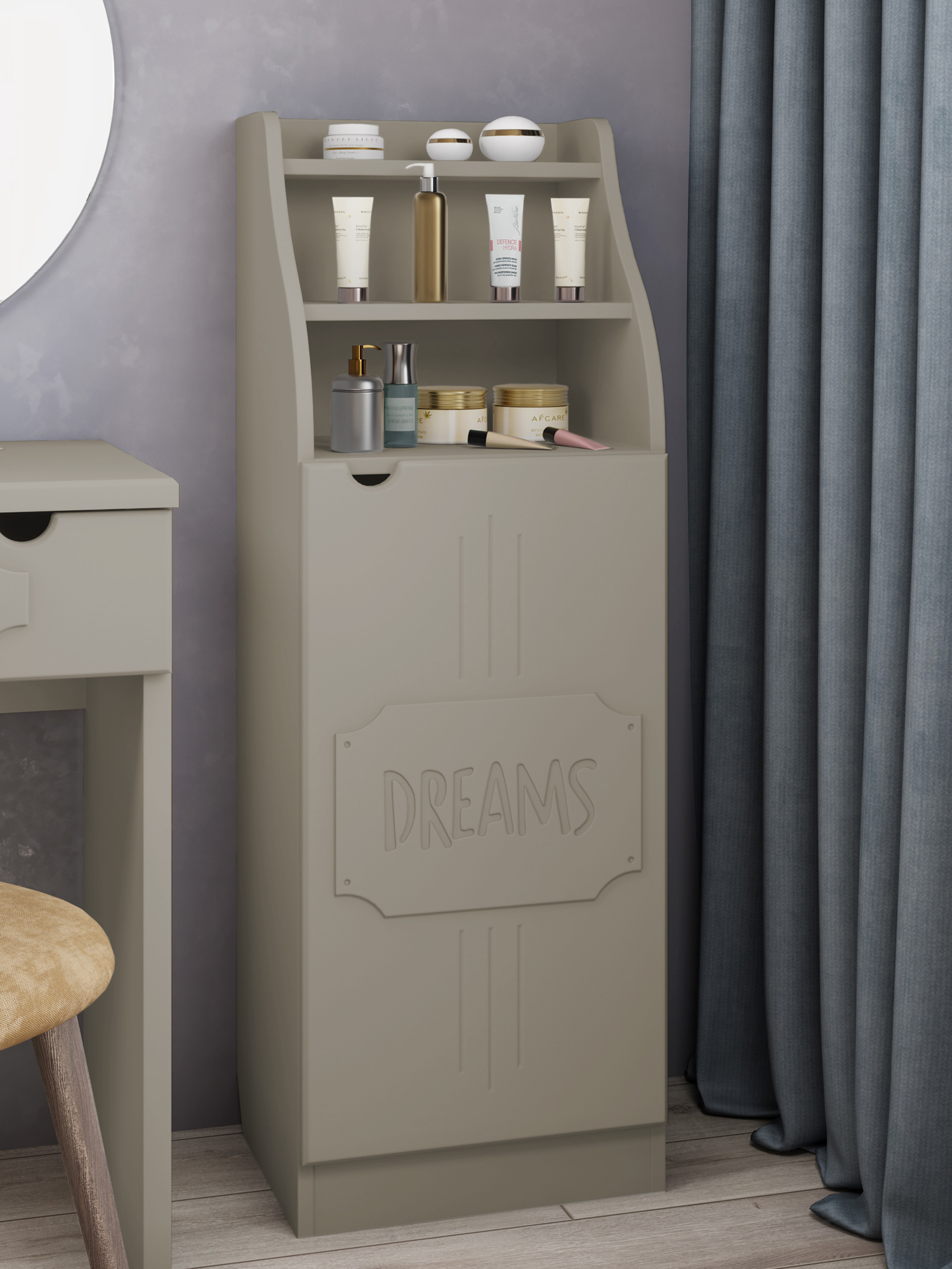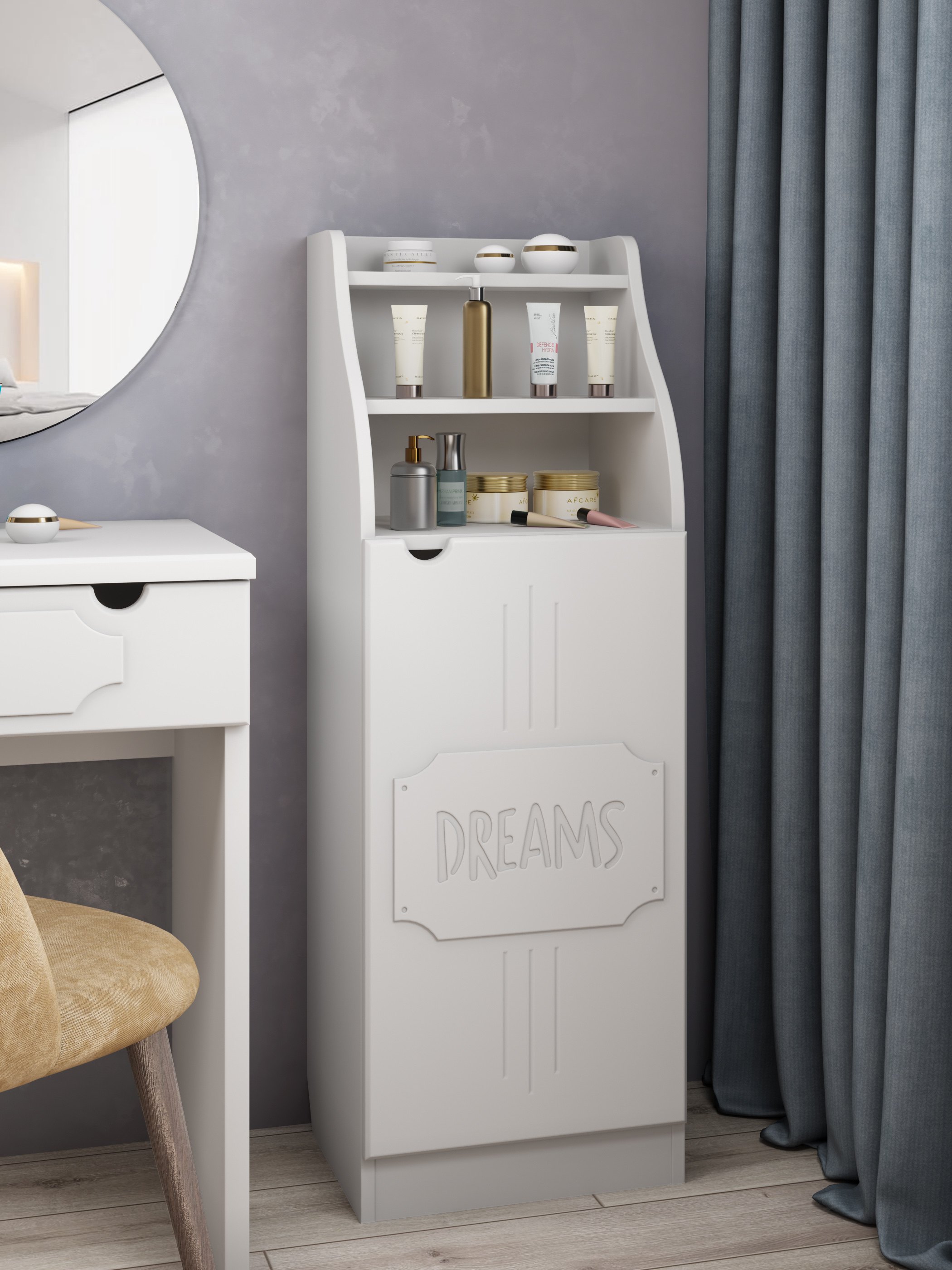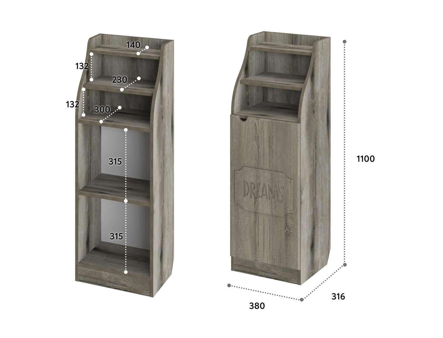 Шкаф ДримСтар ДС-63 прекрасно подойдет для вашей квартиры или загородного дома. Шкаф имеет две открытых верхних ниши и закрытые распашной дверцей полки внизу. Дверца крепится на петли с доводчиками.