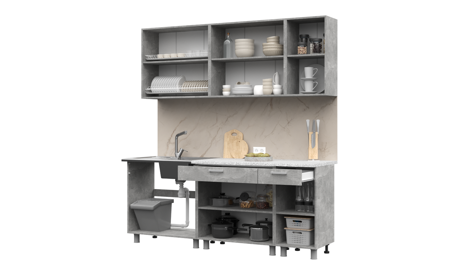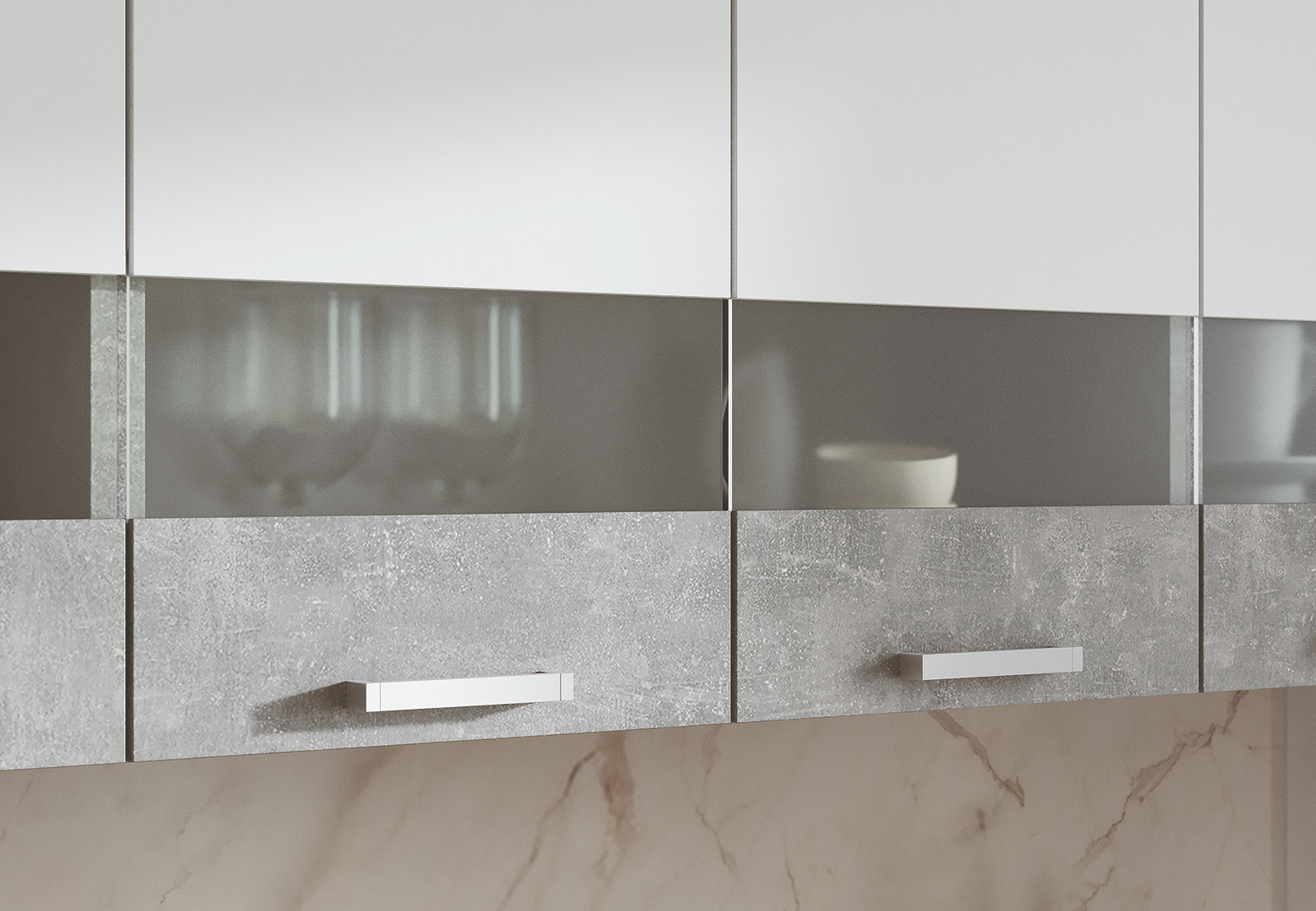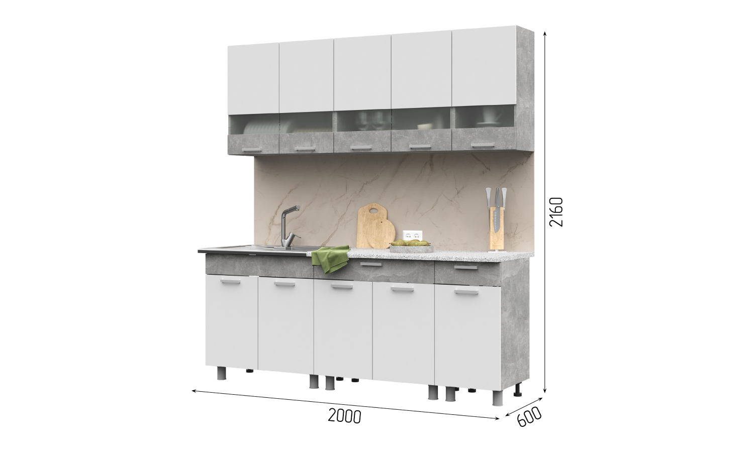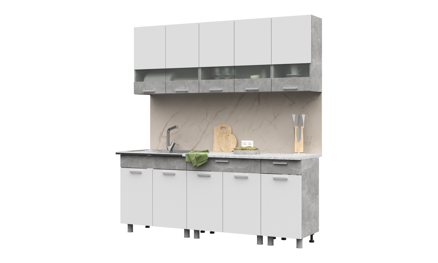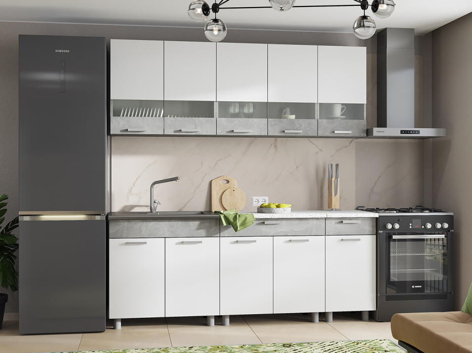 Готовый кухонный гарнитур "Денвер" выполнен в современном стиле, сочетает в себе минимализм и функциональность. Верхние шкафы имеют вставки из полуматового стекла, оно способно создать эффект воздушности, легкости и простора, даже маленькая кухня качественно преобразится, станет оригинальной и особенной. Часть фасадов и каркас имитируют натуральный камень. Шкафы шириной 80см, 80см и 40 см. Рекомендуется сушка для посуды шириной 80см