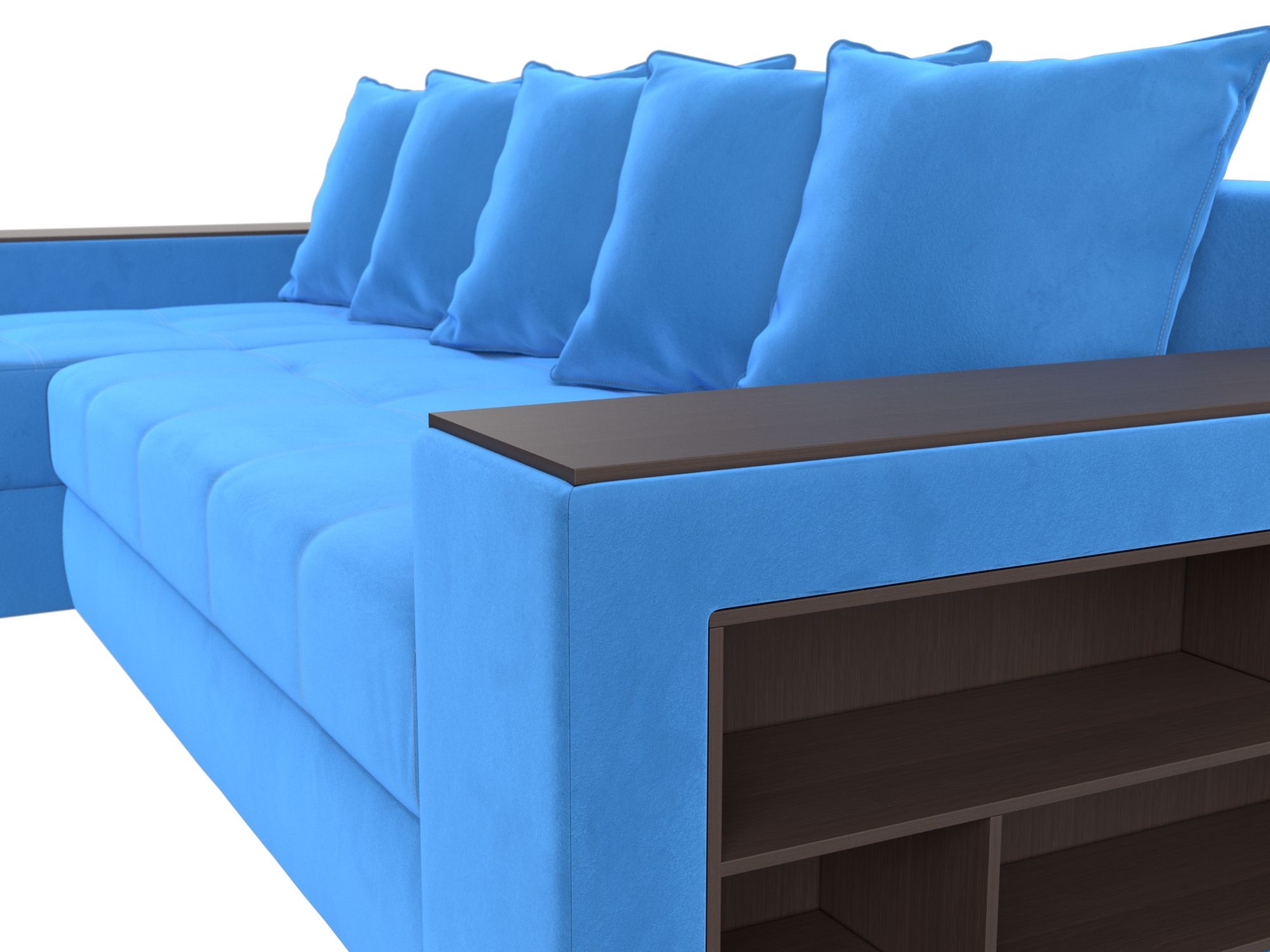 Компактный угловой диван Дубай универсален в использовании. Верх подлокотников – деревянные мини-столики. Сбоку имеются глубокие полочки для хранения предметов декора. Спинка состоит из 5 мягких подушек под цвет обивки. Под углом изделия располагается вместительный ящик для белья.