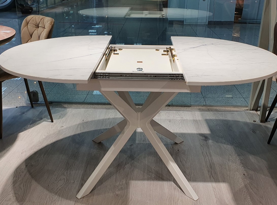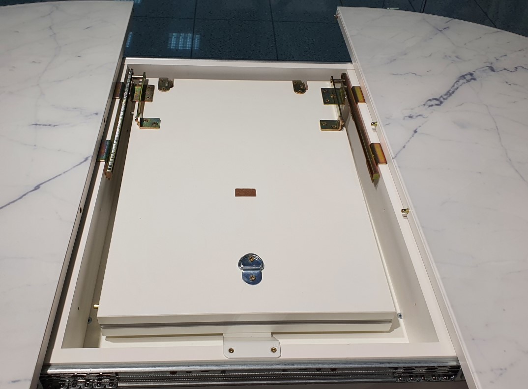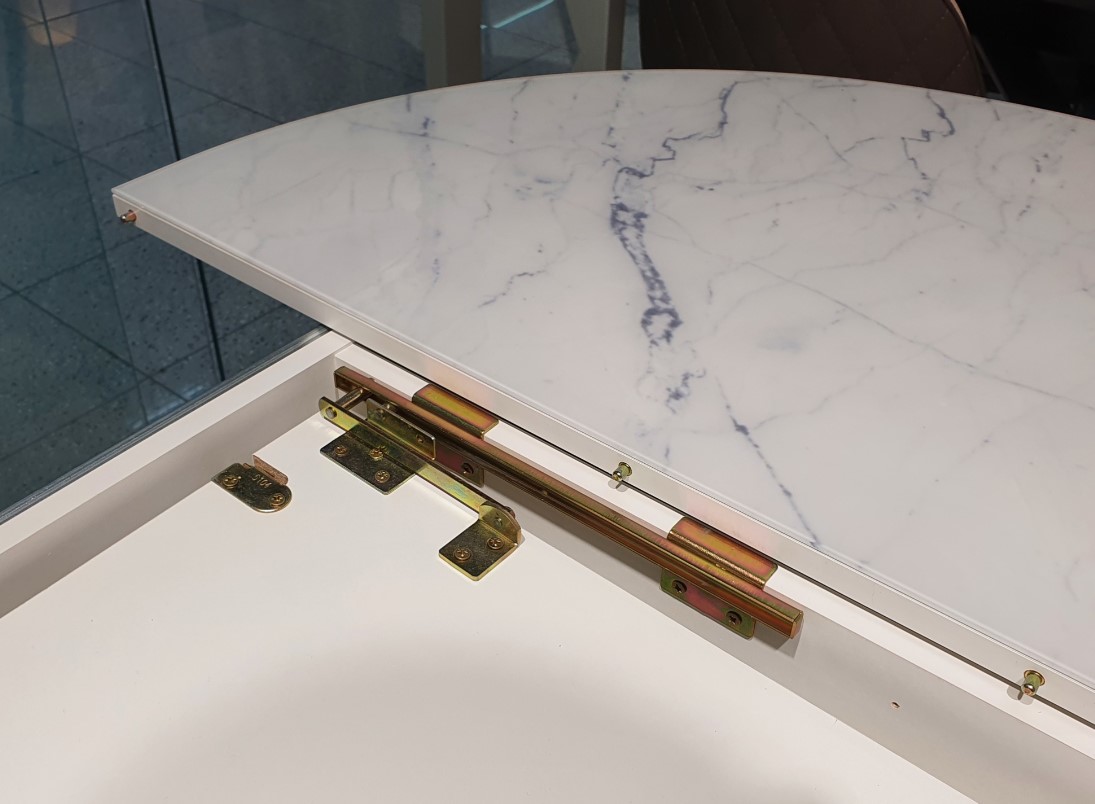 Широкий овал столешницы не имеет острых углов и сохраняет большую полезную площадь. Стол оснащен удобным синхронным механизмом раскладки и большой вставкой "бабочка" полуавтомат. Для раскладки достаточно потянуть кольцо на одной из половинок столешницы и вставка разложится сама. Стекло на вставке повторяет поверхность стола и делает его монолитным при раскладке.