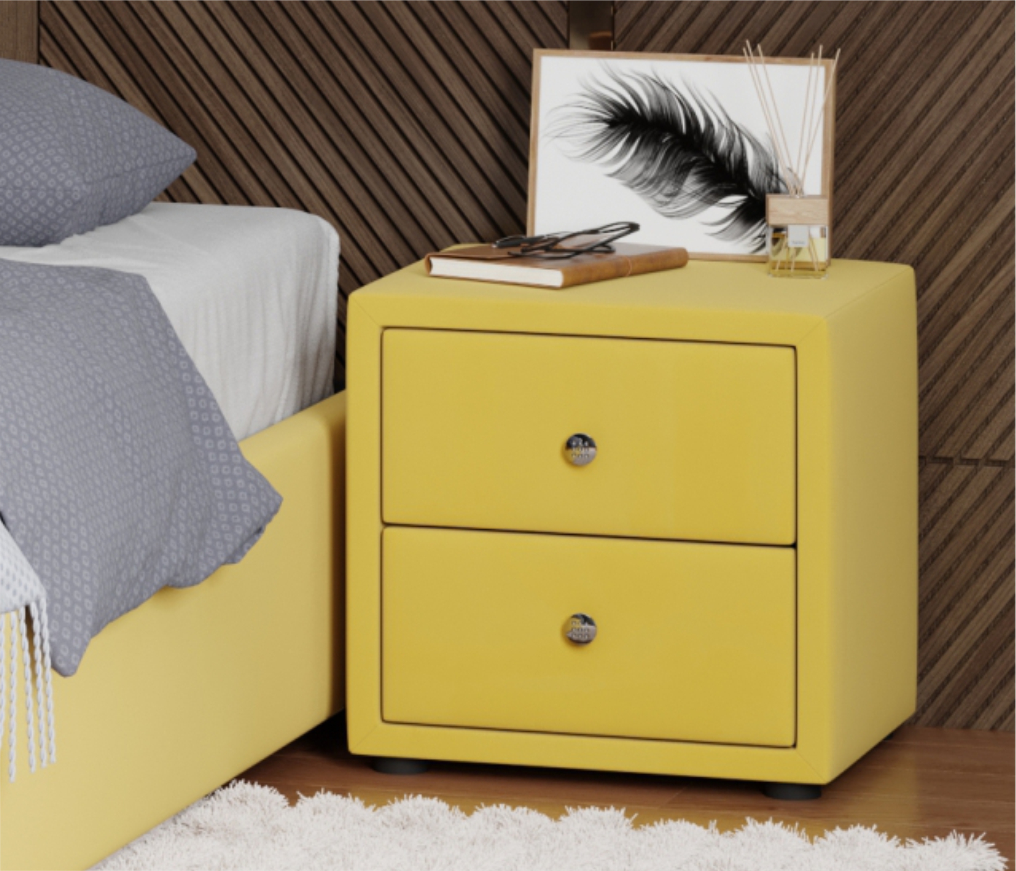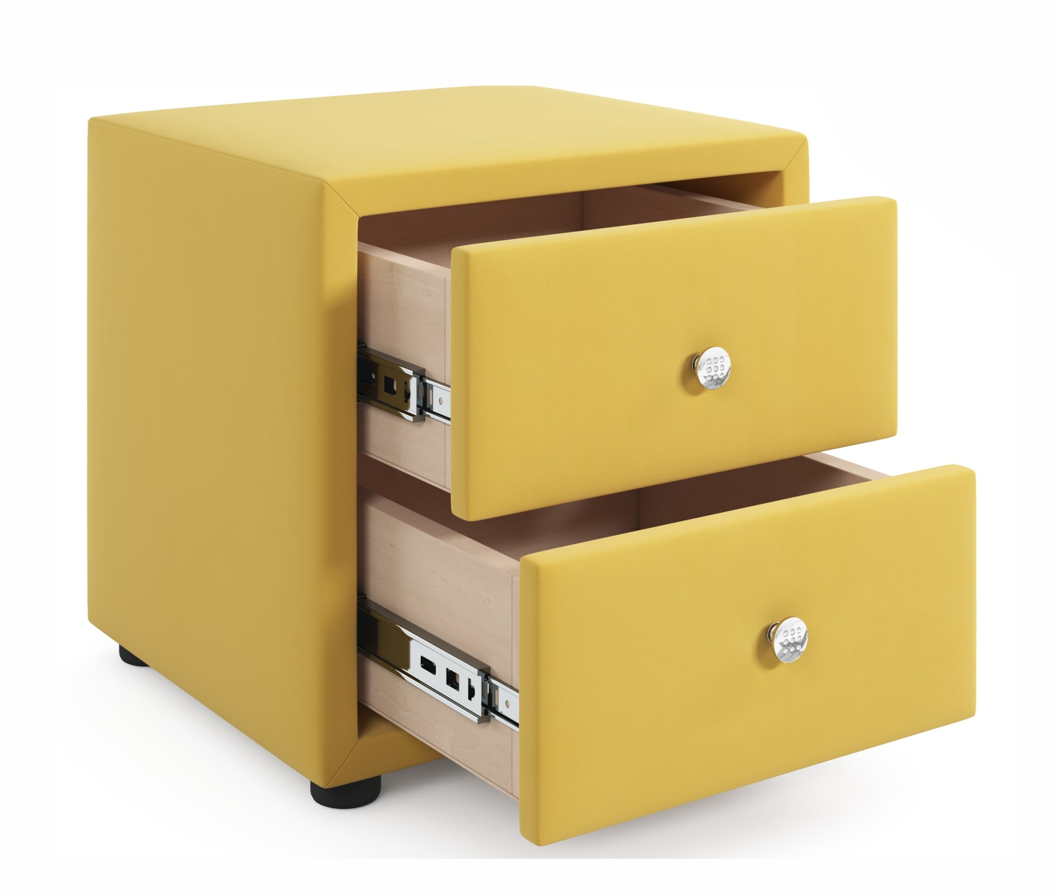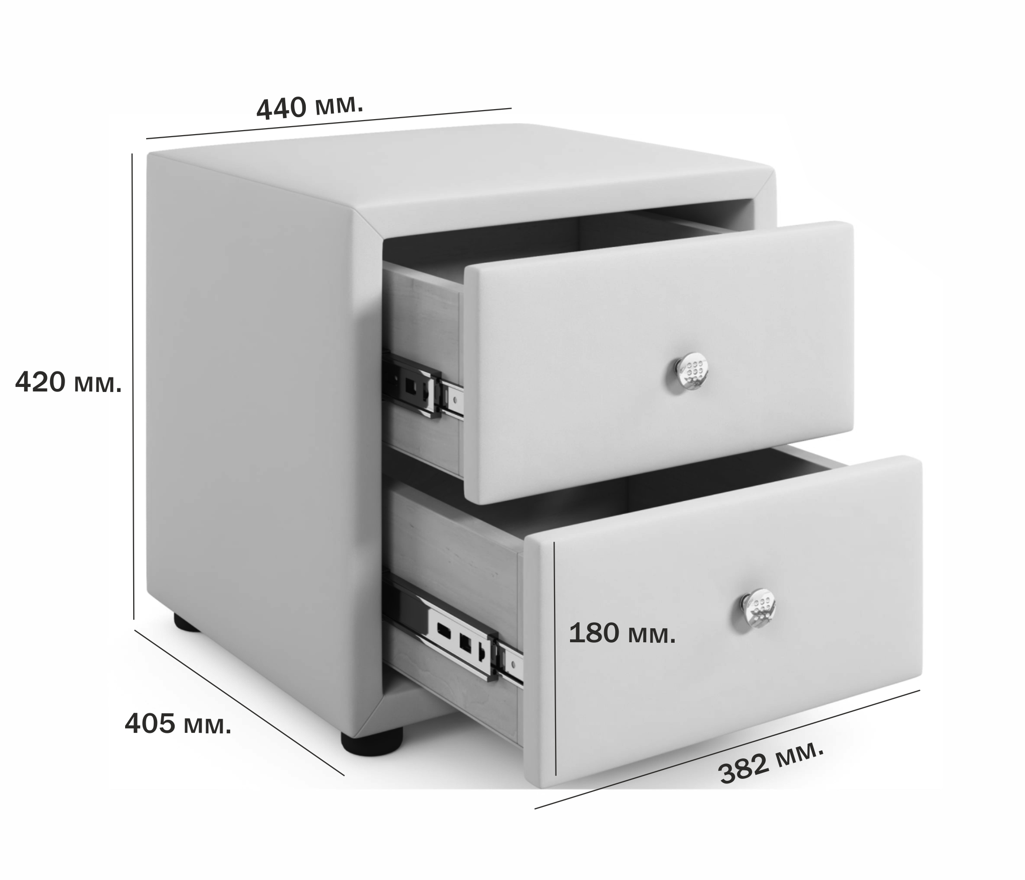 Мягкая тумба укомплектована 2 выдвижными ящиками с декоративными ручками.