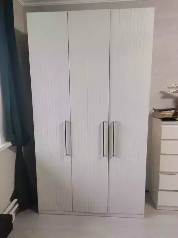 Шкаф оборудован двумя отделениями с одной стороны за дверкой пятью полочками, с другой за двумя распашными дверкми штангой для одежды на вешалках и антресольной и нижней полками. На одной двери внутри расположено зеркало. Универсальная сборка - отделения с полками и штангой при сборке можно расположить с удобной для Вас стороны. Мебель выполнена из экологически чистой ламинированной ДСП 16 мм, класса эмиссии Е1, детали обработаны ПВХ-кромкой. Визуально плита ДСП имеет глубокое тиснение шагрень, а белый цвет фасадов удачно подчёркивает его. Фасады выполнены из с матовой ПВХ-плёнкой. Такое решение делает мебель визуально более "мягкой", комфортной и расслабляющей, что особенно актуально для спальни. В производстве спальни Валенсия использована фурнитура высоких стандартов. Зеркало выполнено из высококачественного зеркального полотна толщиной 4 мм. Поставляется в разобранном виде в надёжной упаковке, с комплектом сборочной фурнитуры и инструкцией по сборке.