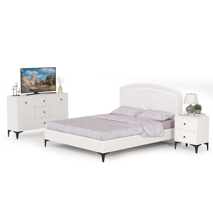 Комод Валенсия с кроватью 1600 и прикроватной тумбочкой - стильная светлая спальня в популярном стиле ар-деко.