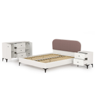Кровать с мягкой спинкой 1600 с комодом Валенсия и тумбочкой два ящика - стильная светлая спальня в популярном стиле ар-деко.