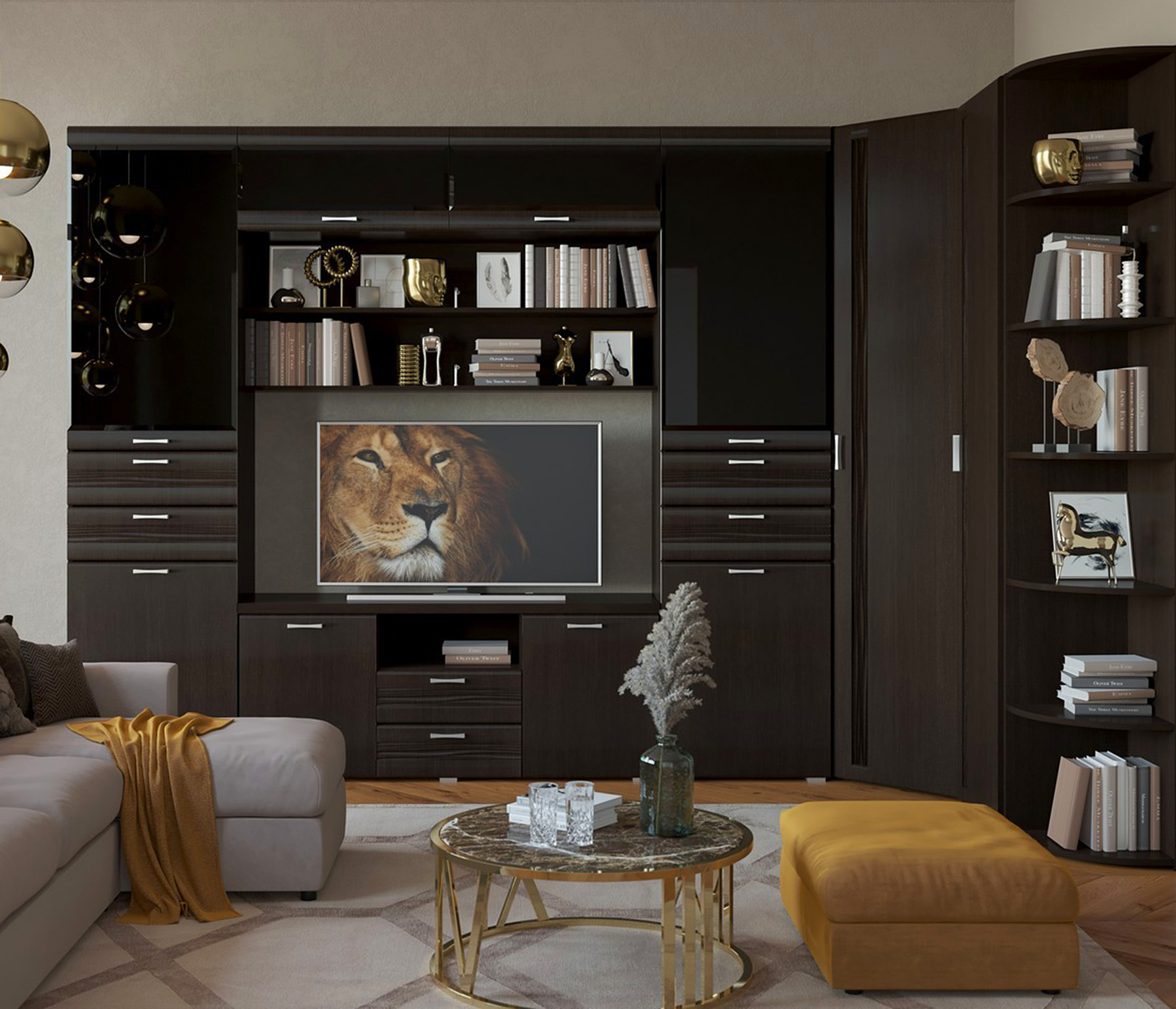 Трёхсекционная тумба из комплекта модульной гостиной Лотос, менее глубокий вариант. Слева и справа – тумбочки, по центру – открытая полка и выдвижные ящики. На фасаде выдвижных ящиков – фрезерованная МДФ. Ручка 96 мм. Регулируемые опоры L-20.