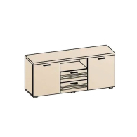 Трёхсекционная тумба из комплекта модульной гостиной Лотос, менее глубокий вариант. Слева и справа – тумбочки, по центру – открытая полка и выдвижные ящики. На фасаде выдвижных ящиков – фрезерованная МДФ. Ручка 96 мм. Регулируемые опоры L-20.